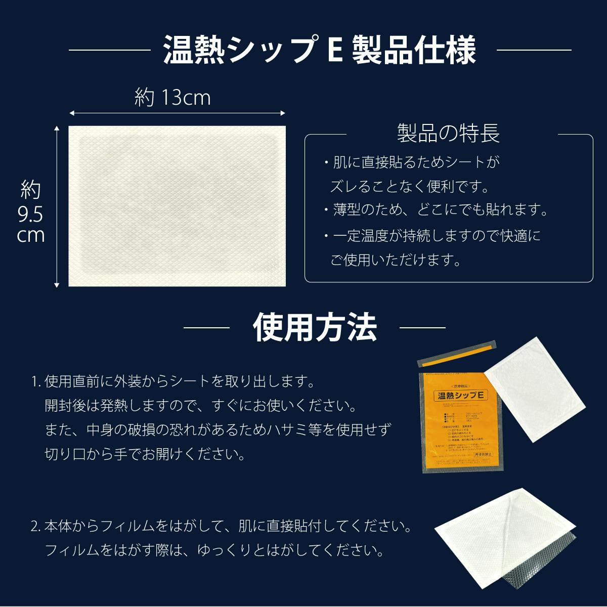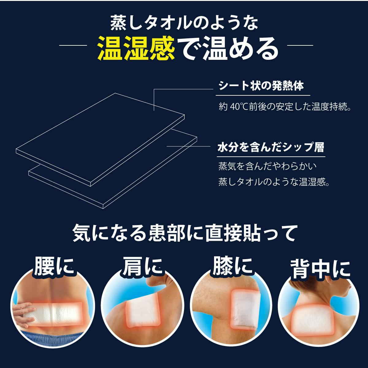 ・肌に直接貼るためシートがずれず便利です。・シートタイプで薄型の為、どこにでも貼れます。・一定温度が持続しますので快適にご使用いただけます。・40℃前後の安定した温度持続。・血行を促進し、痛みの緩和。・蒸気を含んだやわらかい温熱。