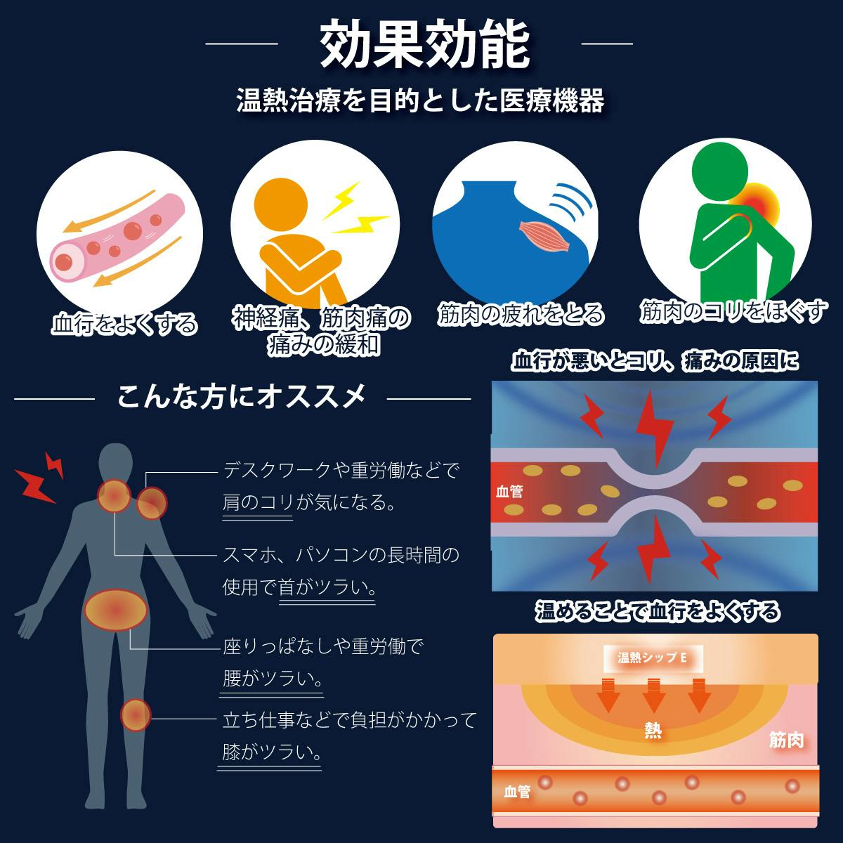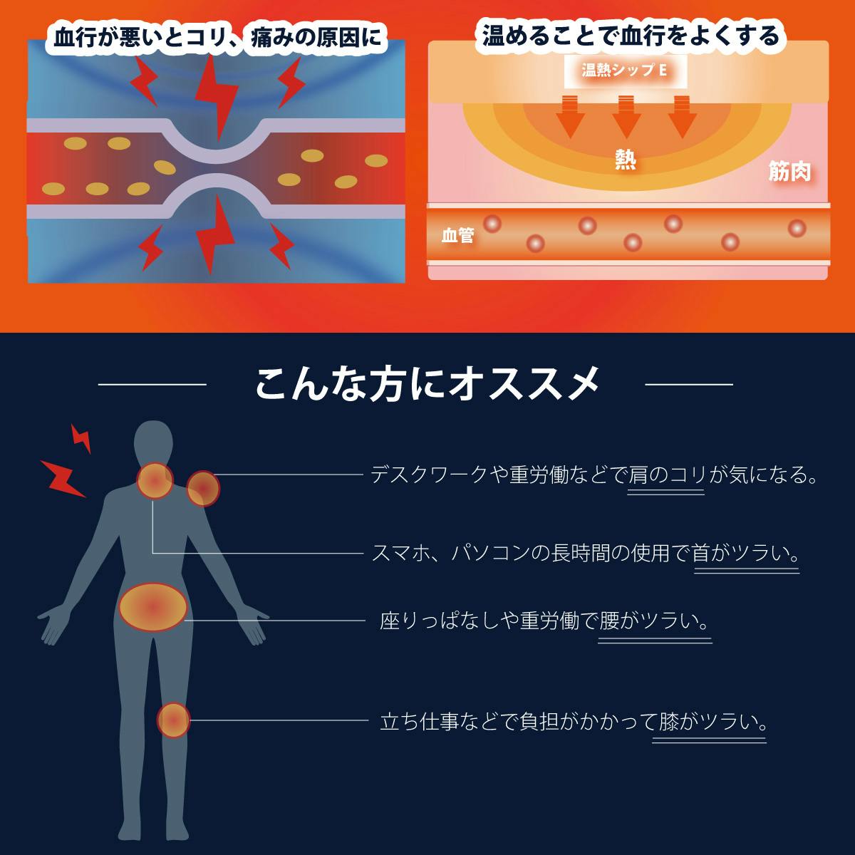 ・肌に直接貼るためシートがずれず便利です。・シートタイプで薄型の為、どこにでも貼れます。・一定温度が持続しますので快適にご使用いただけます。・40℃前後の安定した温度持続。・血行を促進し、痛みの緩和。・蒸気を含んだやわらかい温熱。