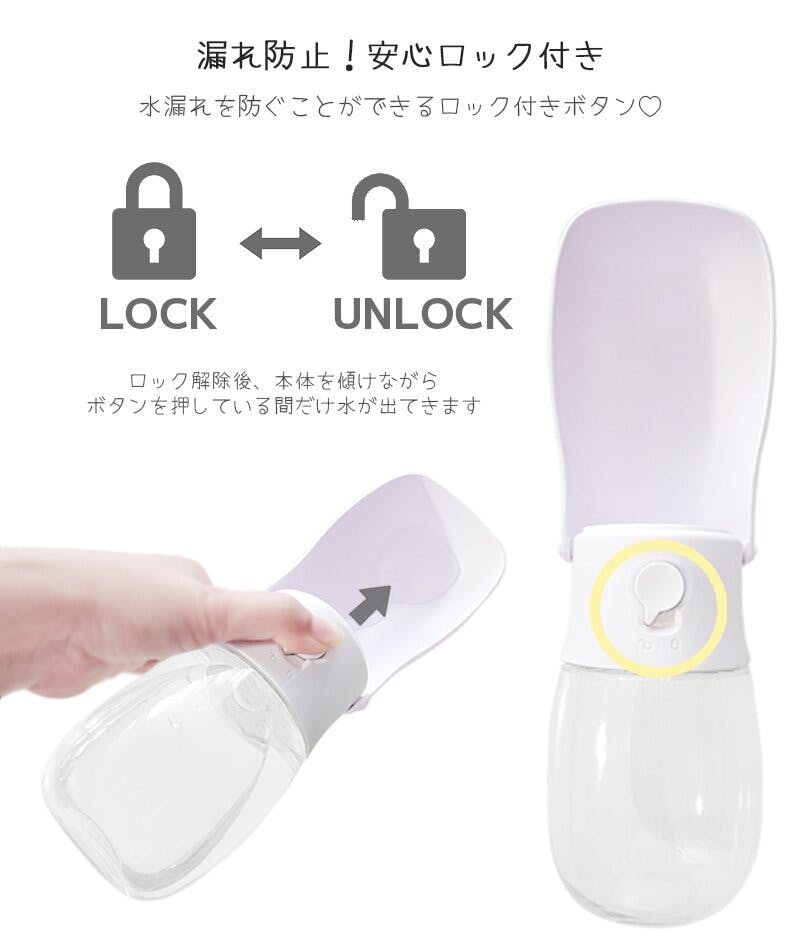 安心ロック付きのポータブルウォーターボトル!熱中症予防にも役立つお出かけの際の必需!!折りたたんで持ち運ぶことができるのでとっても便利です♪余分なお水を戻すことができるので、車内やドッグカフェなどの室内でも気軽に使用できる
