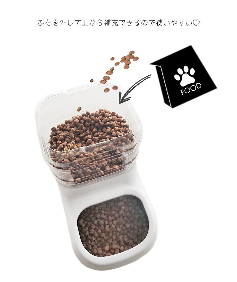 重力を利用した給餌・給水設計のため、電源不要で安心!丸洗い出来ていつでも清潔にお使いいただけます。フードタンクはふたを外して上部からフードを補充することができてとっても便利!フードが減ると自動的に給餌されます。