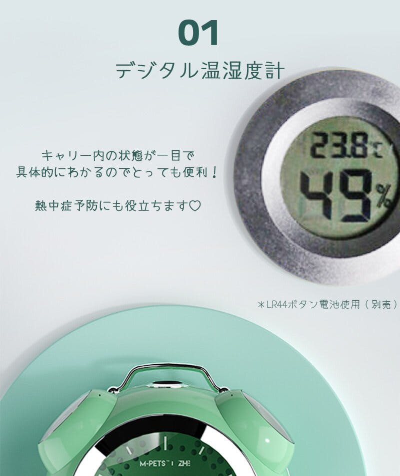 ・背面が大きく開き、わんちゃん・ねこちゃんの出し入れも簡単!・外側からのみ開く側面の小さな開口部から手を入れることができ、ドアを開けずにわんちゃん・ねこちゃんを撫でてあげることができます。緊張しがちなデリケートな子でも安心です。・ショルダーストラップとプラスチックハンドル付きなので、リュックとしても手持ちもどちらでも使えます。・温湿度センサー付きで安心です。(ボタン電池使用)