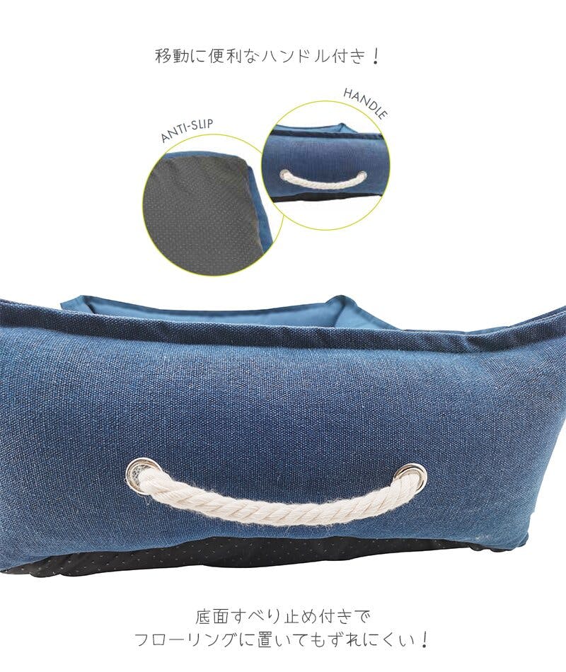 リサイクル素材でできているとは思えないくらい高級感のあるおしゃれなベッドです。手洗い可能なのでお手入れも簡単!(色落ちにご注意ください)中綿がしっかり詰まっていて、弾力がありヘたりにくいのもうれしいポイント☆移動に便利なハンドル付き!