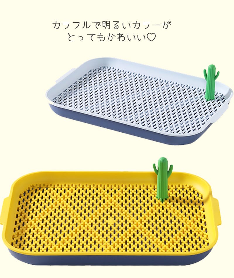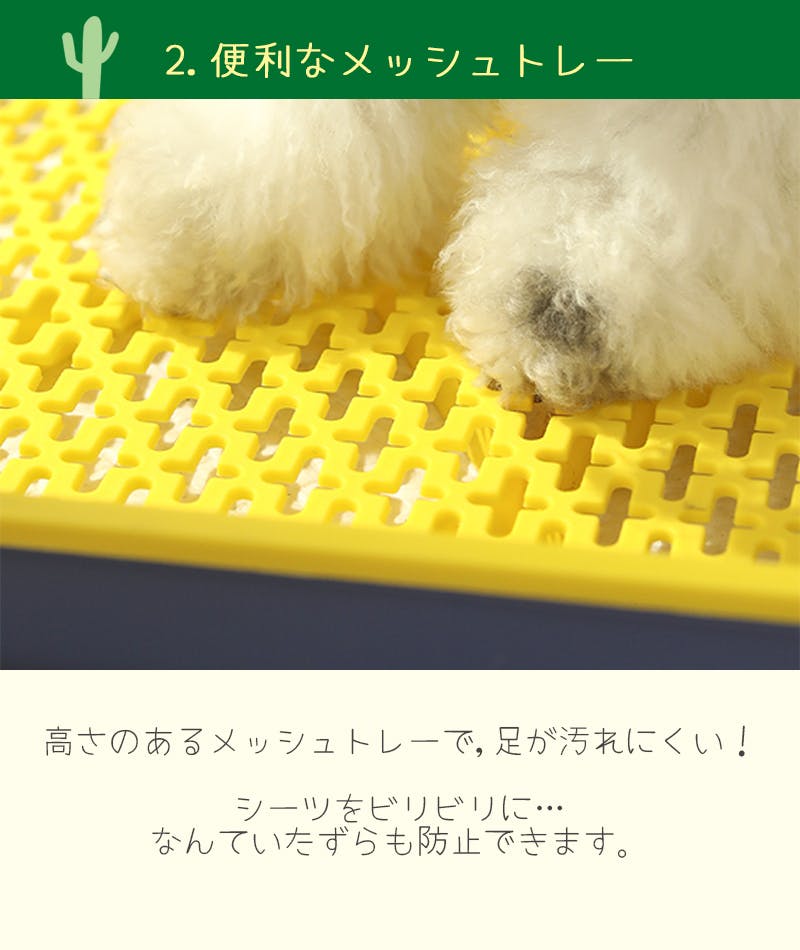 ・インテリアのアクセントとなるデザイン性だけでなく、機能性も兼ね備えた便利でかわいいわんちゃん用トイレ。・モチーフのサボテンは、足をあげておしっこをするわんちゃんのマーキングポールとして、トイレトレーニングに使えます。サボテンは、わんちゃんの癖や体形に合わせて、好きな場所に移動することができます。・メッシュとトイレシートの間には隙間があるため、清潔で衛生的。丸洗いも簡単です。