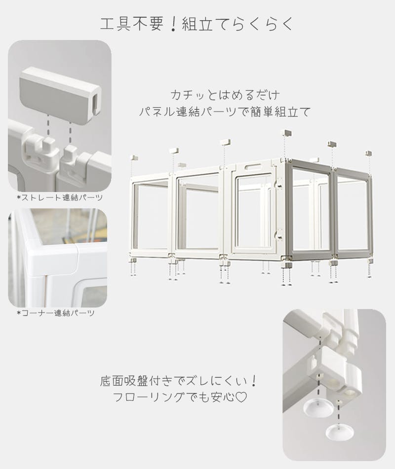 ・ホワイトフレームを軸に丈夫な透明パネルで構成されたスタイリッシュなペット用ケージ。お部屋のインテリアを邪魔せず、空間を広く見せることができます。・透明パネル部分は、厚みのある高品質なポリカーボネート素材を使用。ケージの中の様子がよく見え、愛犬の表情まで伺うことができます。お手入れ簡単で、拭き取るだけで綺麗にご使用いただけます。・パネルを連結パーツではめるだけ、工具不要で組み立ても簡単です。
