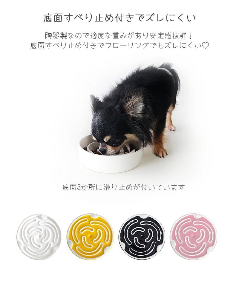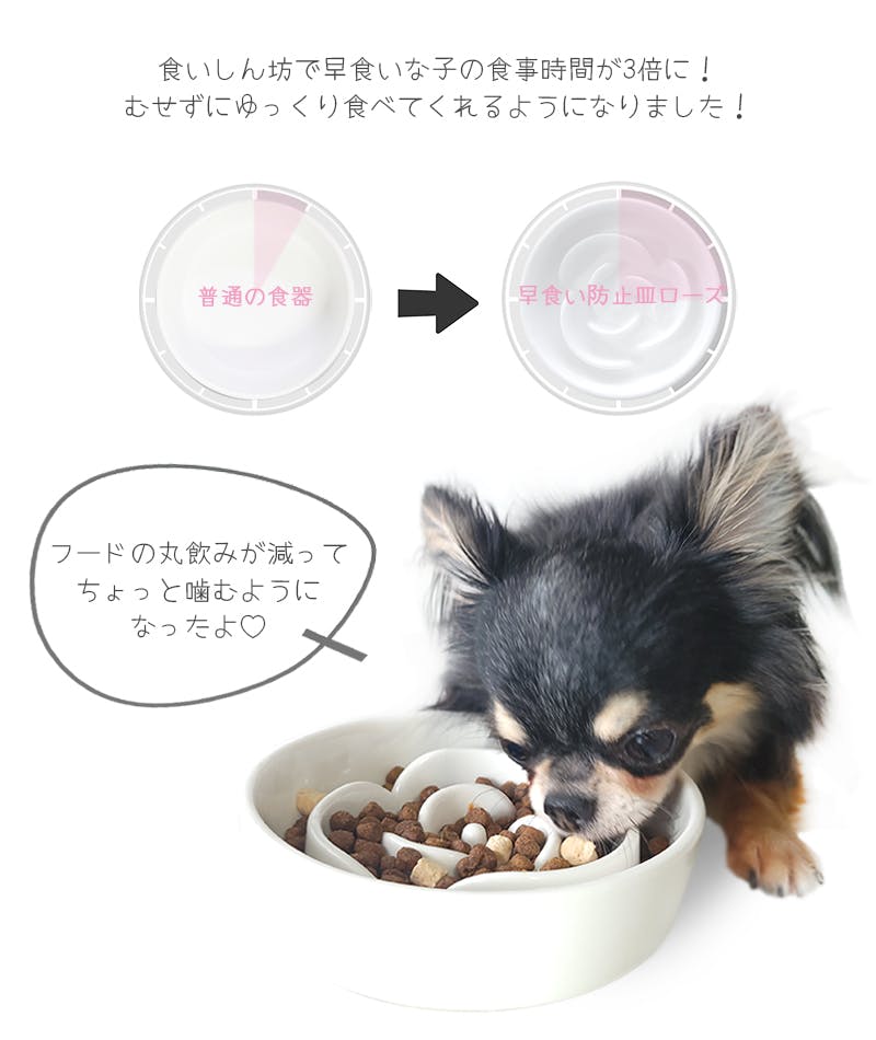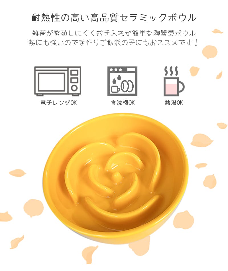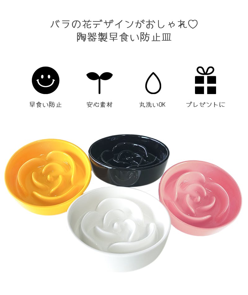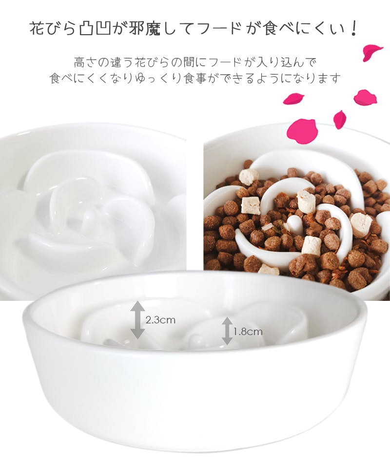 ・かわいいバラの花デザインの早食い防止皿です。高さの違う花びらの凸凹が邪魔をして、フードの丸飲みを抑制し食事速度を軽減。・食いしん坊で早食いな子におすすめ!喉につまる、消化不良、肥満などの問題を解消でき、健康的な食べ方を促進します。・厚みのある丈夫な陶器製食器。電子レンジ・食洗機・熱湯OK。傷がつきにくく衛生的。