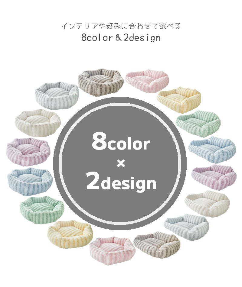 ・毛足短めのファーと、くりくりでかわいいアルパカボアのキュートなストライプ生地を使用したおしゃれなベッドです。インテリアや好みに合わせて選べる豊富なカラーバリエーション8カラー&2デザイン。スクエアタイプは出入りスムーズな優しい設計、ラウンドタイプはゆったりとした安心感のある寝心地です。・弾力のある中綿がたっぷりでふわふわの寝心地。ふちに頭をのせて枕にしても沈み込みすぎず快適です。
