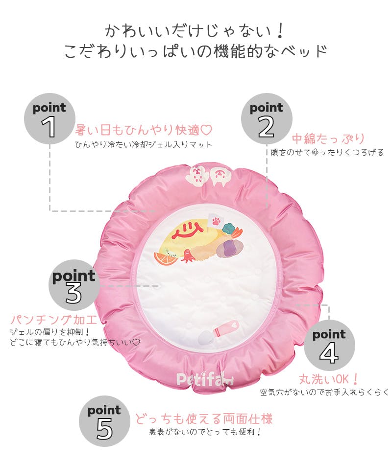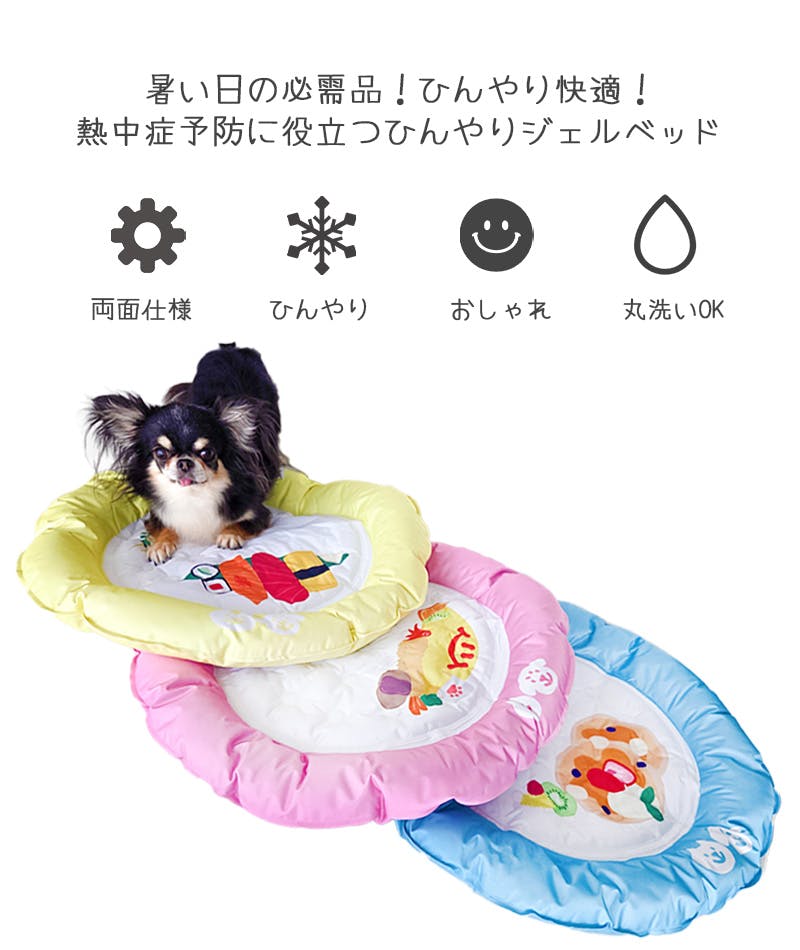 ・ペットの夏バテ・熱中症対策に。おいしそうなプレートデザインのかわいいひんやりジェルベッド。愛犬・愛猫をトッピングして完成。映え写真が撮れます。・柔らかいのに破れにくい厚みのある生地をカバーに使用。爪で引っ?いても破れにくい丈夫な作りです。クッション性があるふっくら中綿入りの厚みのあるフチ付きで、アゴを乗せてくつろげます。・汚れを簡単に拭き取りやすく、お手入れが簡単です。