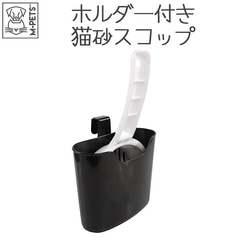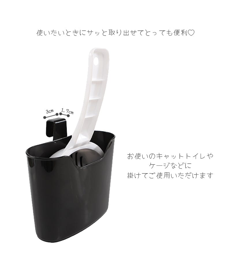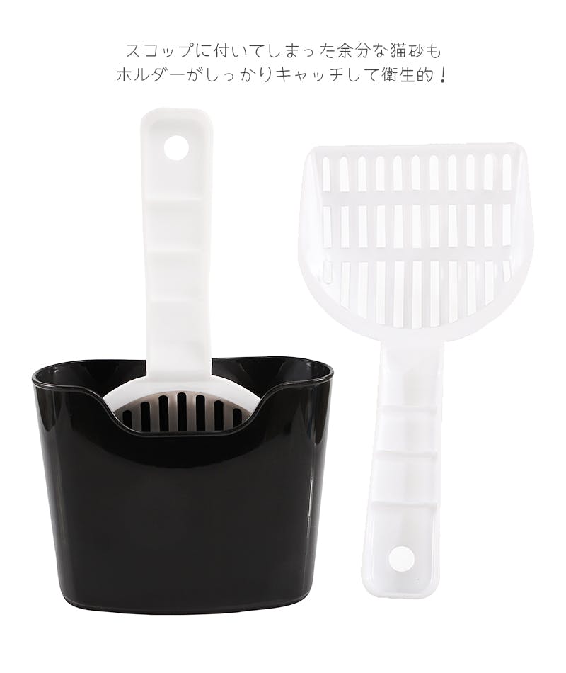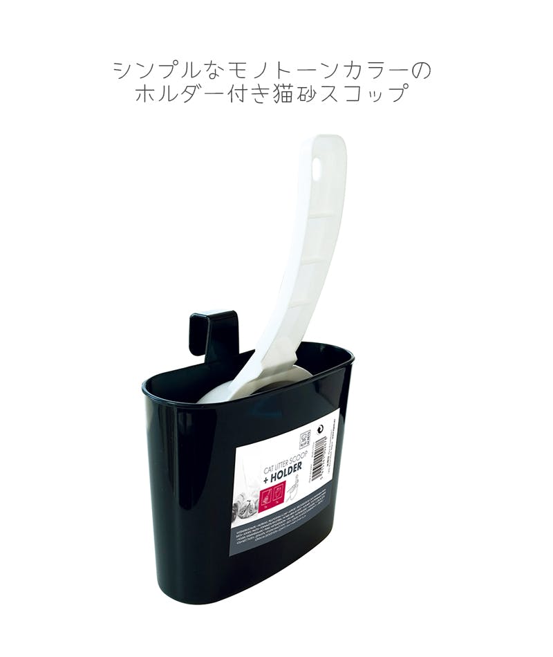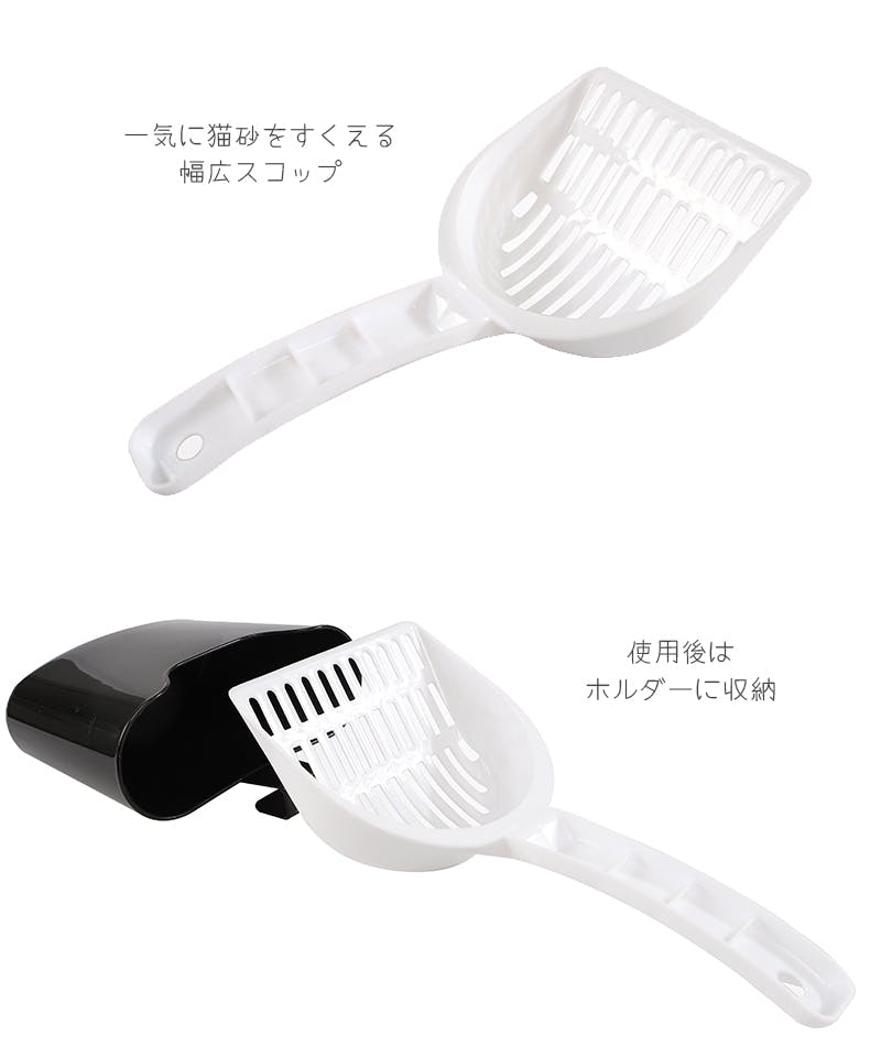 ・モノトーンカラーでシンプルなホルダー付き猫砂スコップ。使用後はホルダーに入れるだけ。キャットトイレにかけていつでもサッとトイレ掃除ができてとっても便利です。・スコップについた余分な猫砂も、ホルダーがしっかりキャッチして衛生的。・一気に猫砂をすくえる幅広サイズ。