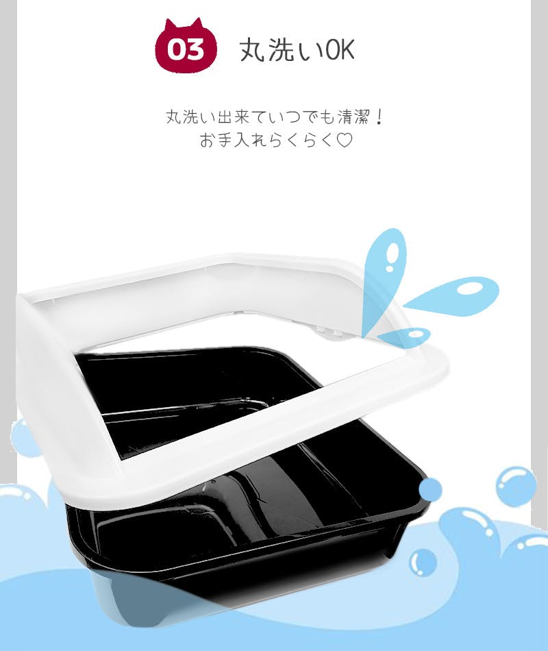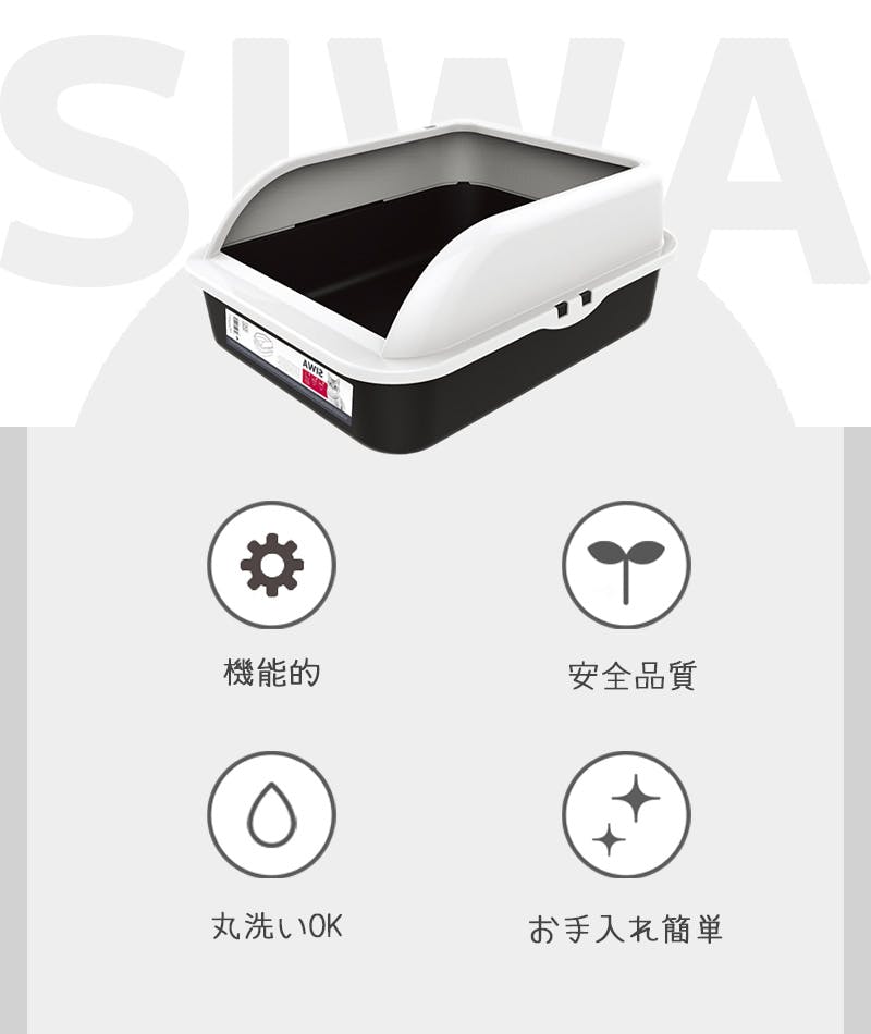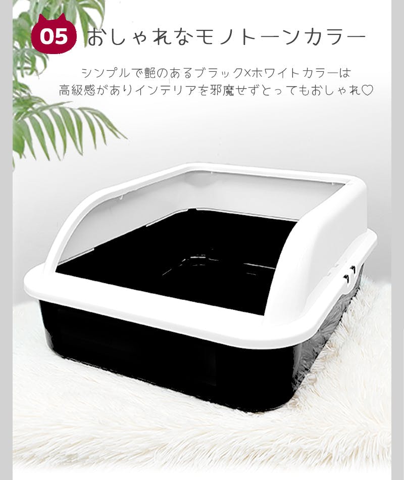 ・大容量サイズの猫用トイレ。ゆったりサイズで、大型猫や複数飼いにおすすめ!・砂が外に飛び散りにくい設計のシンプルな猫用トイレ。・モノトーンカラーでシックなお部屋によくなじみ、またフタ部分は真っ白なので、大きさのわりに圧迫感を与えません。・フタを外して丸洗いができ、清潔にお使いいただけます。