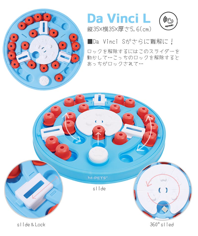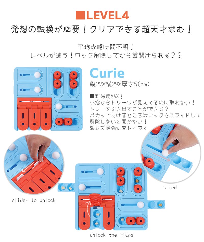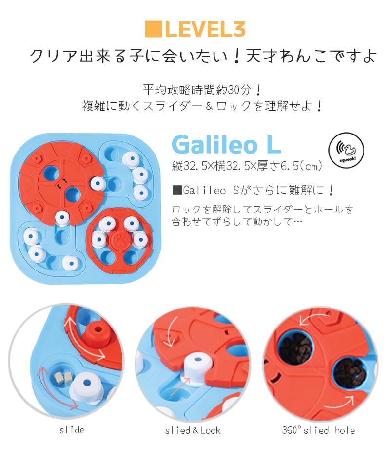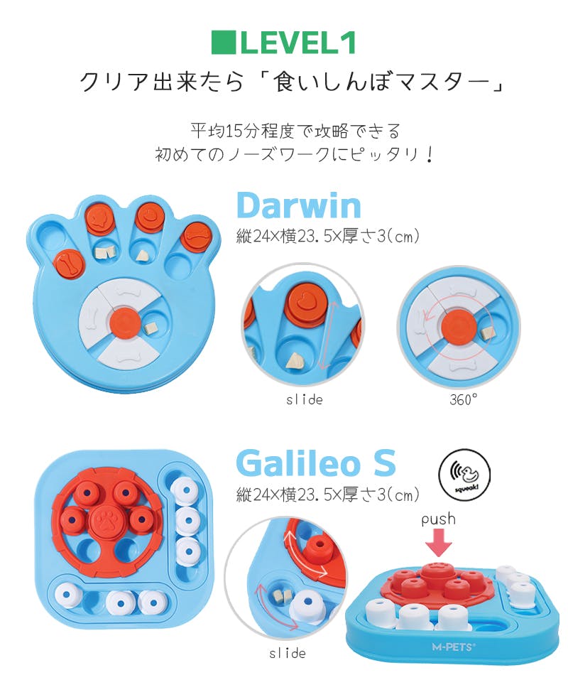 ・頭を使って遊ぶノーズワークトイ。種類によってレベル1~レベル4まで、難易度が変わります。賢い偉人たちの名前が付けられた知育トイにチャレンジ!難関をクリアしてご褒美をゲット!楽しみながら頭を使って遊ぶことで、わんちゃんの好奇心を満たしてくれます。だんだんとステップアップしていく楽しさも!・キャップをスライドさせたり、モジュールを動かすことでトリーツを見つけて、おいしく楽しく遊べます。