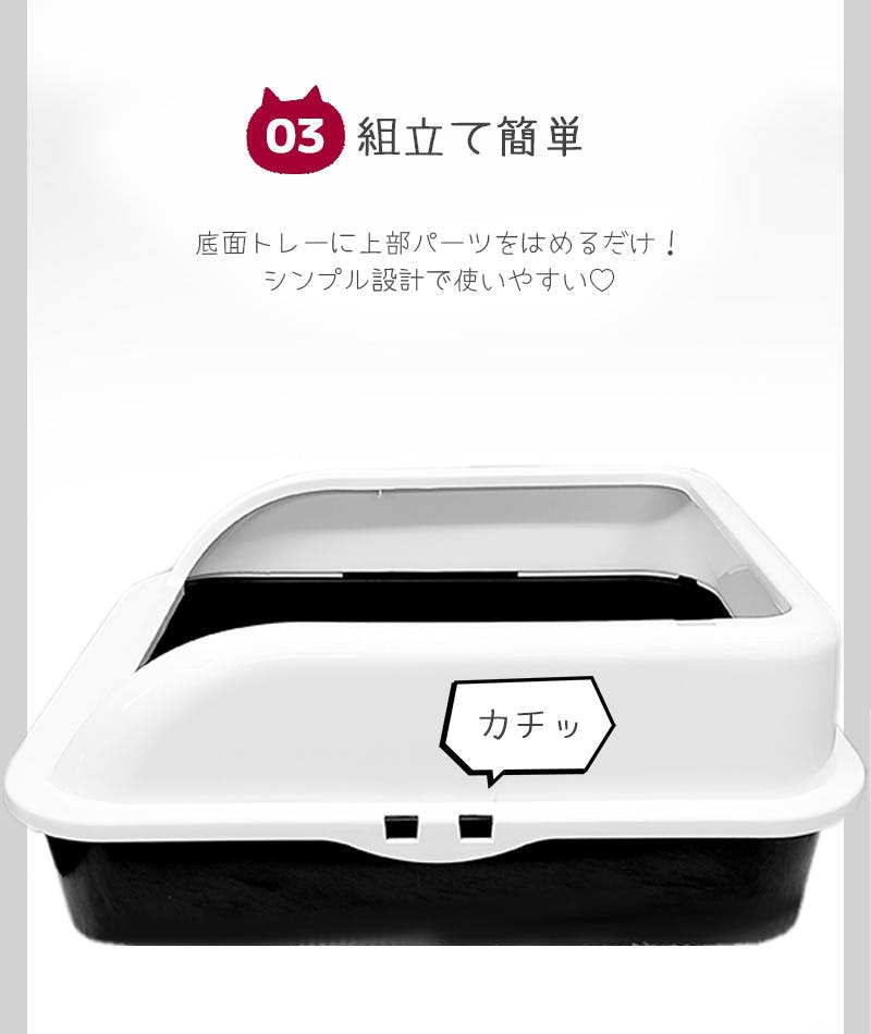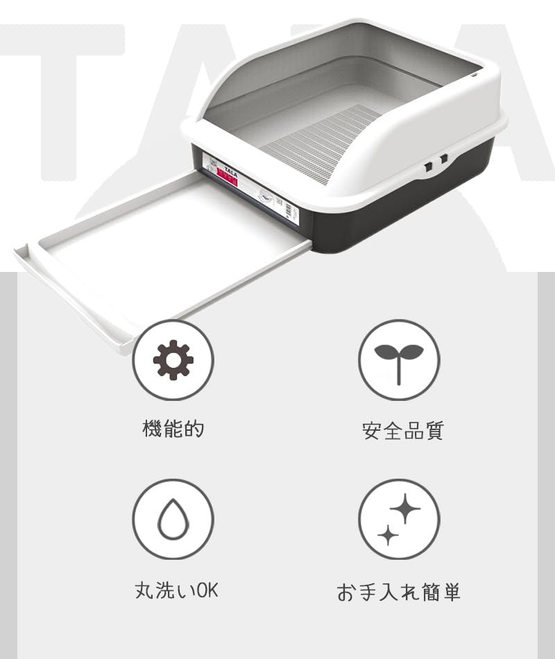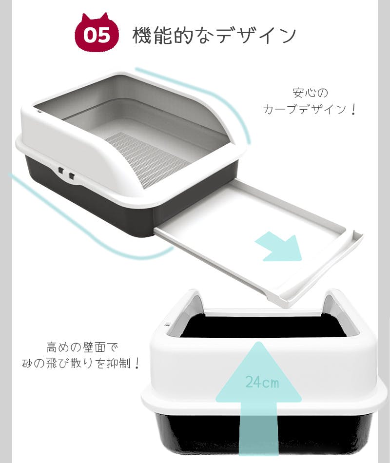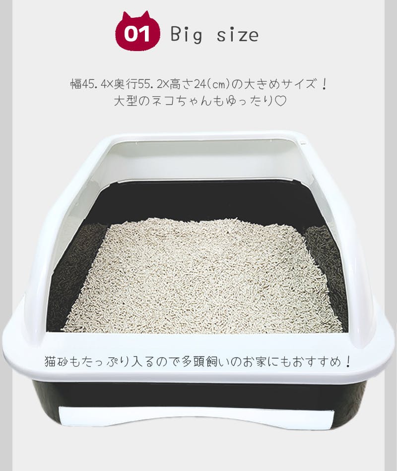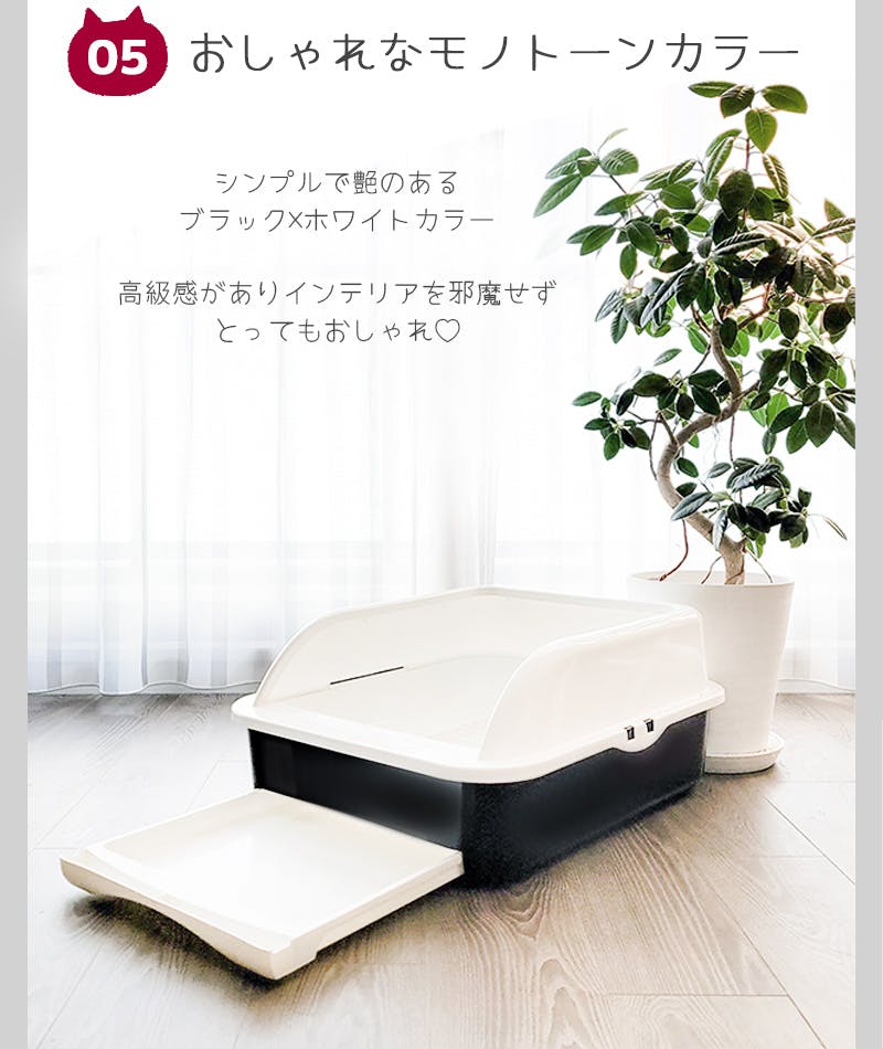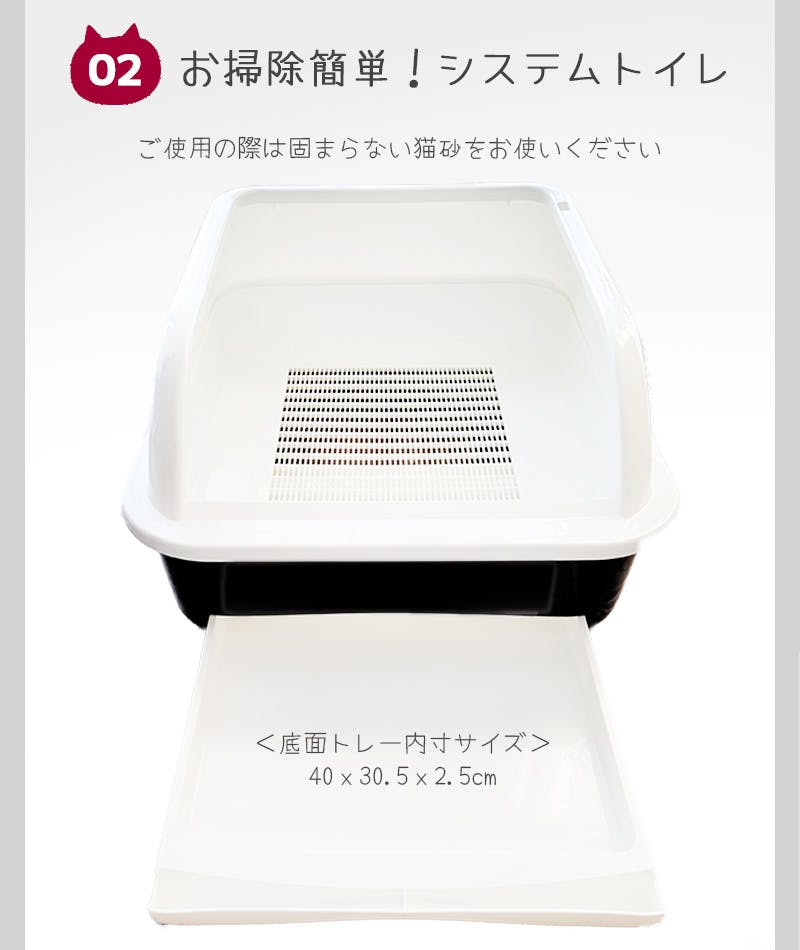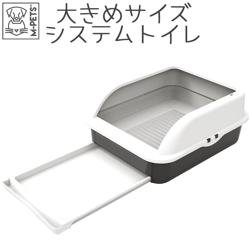 ・大容量サイズの猫用システムトイレ。ゆったりサイズで、大型猫や複数飼いにおすすめ!・砂が外に飛び散りにくい設計のシンプルな猫用トイレ。引き出し式のトレイ付きで、シーツを引いて使用します。・モノトーンカラーでシックなお部屋によくなじみ、またフタ部分は真っ白なので、大きさのわりに圧迫感を与えません。・フタを外して丸洗いができ、清潔にお使いいただけます。