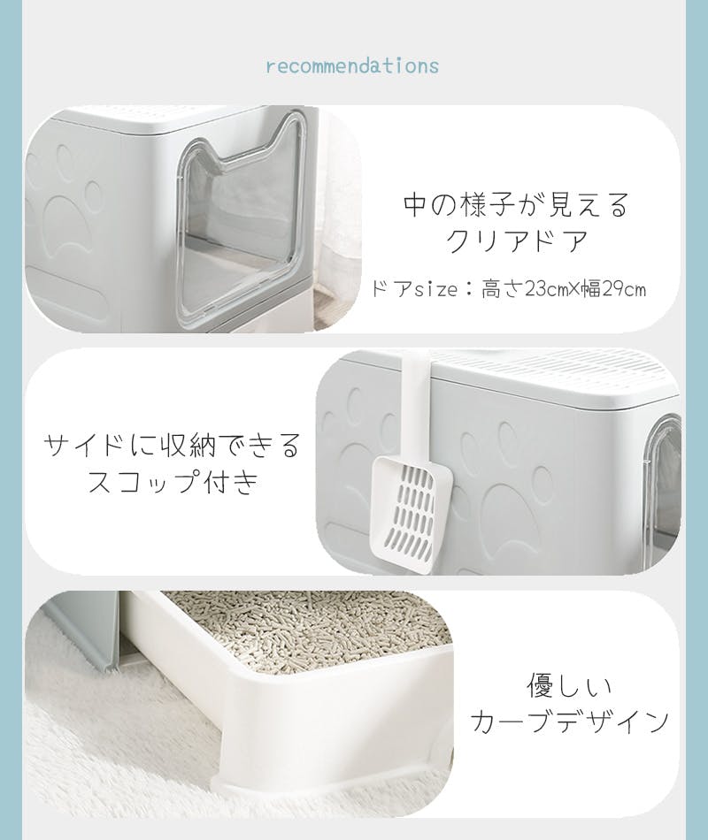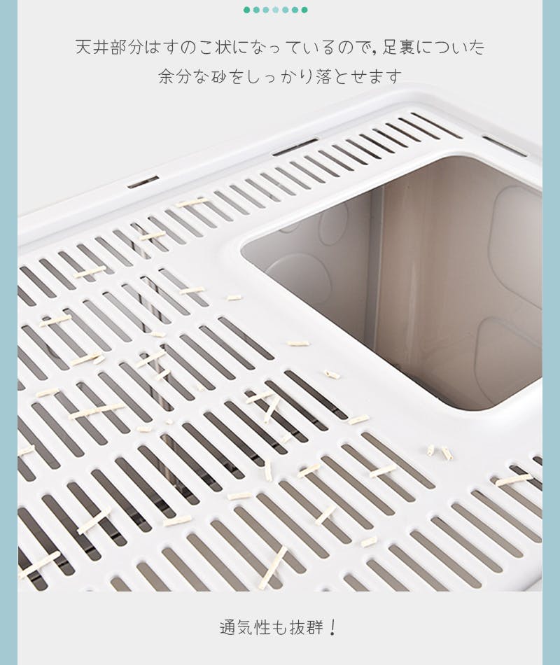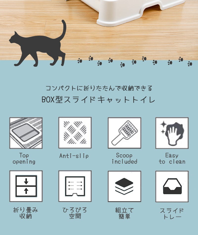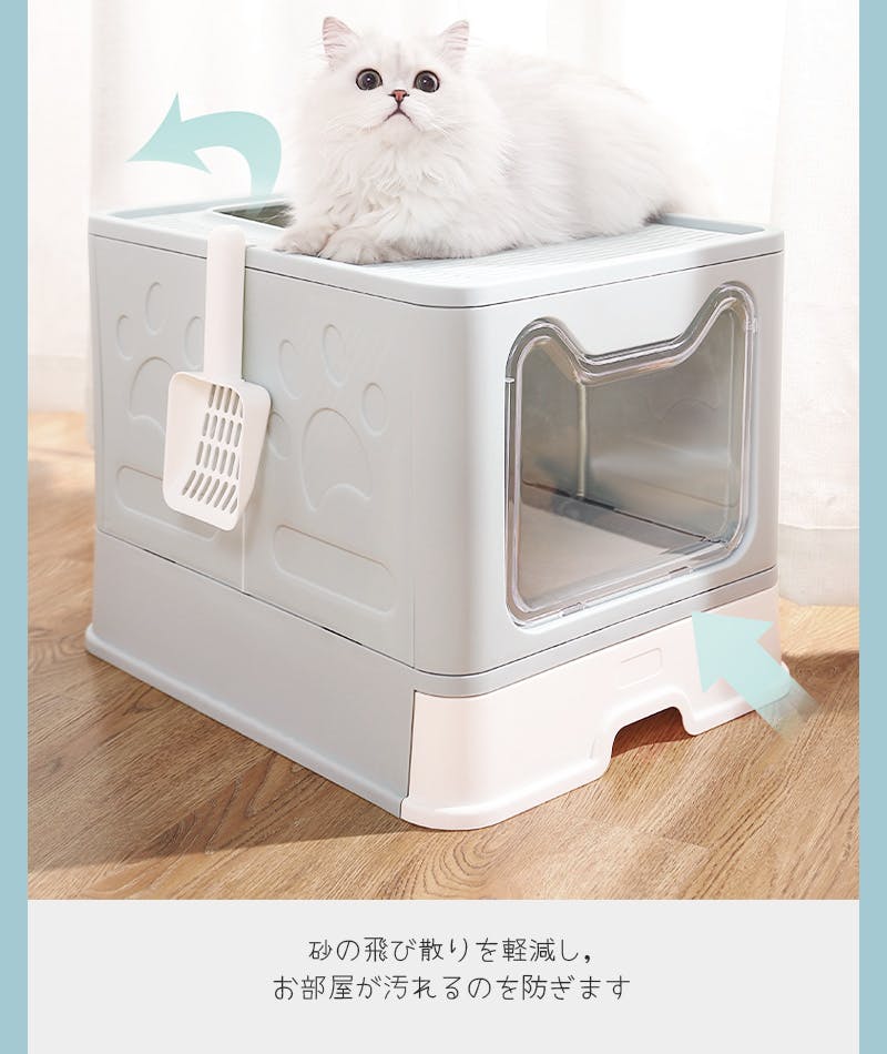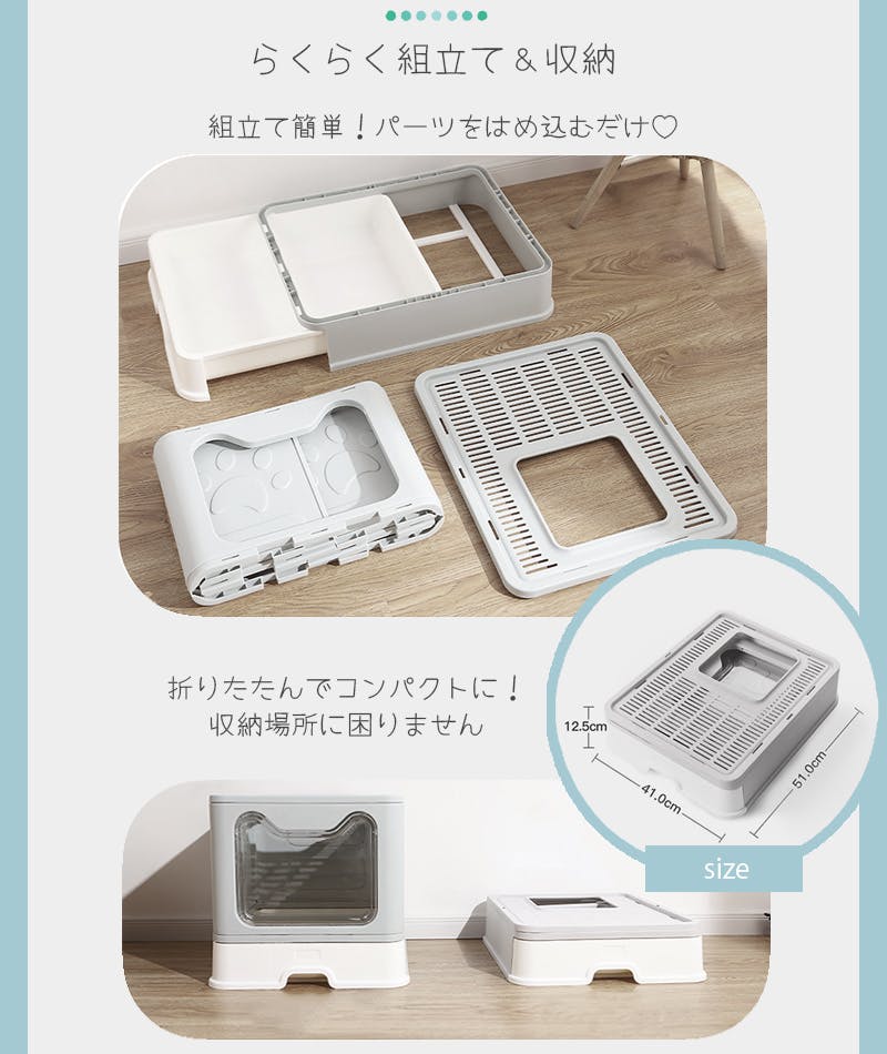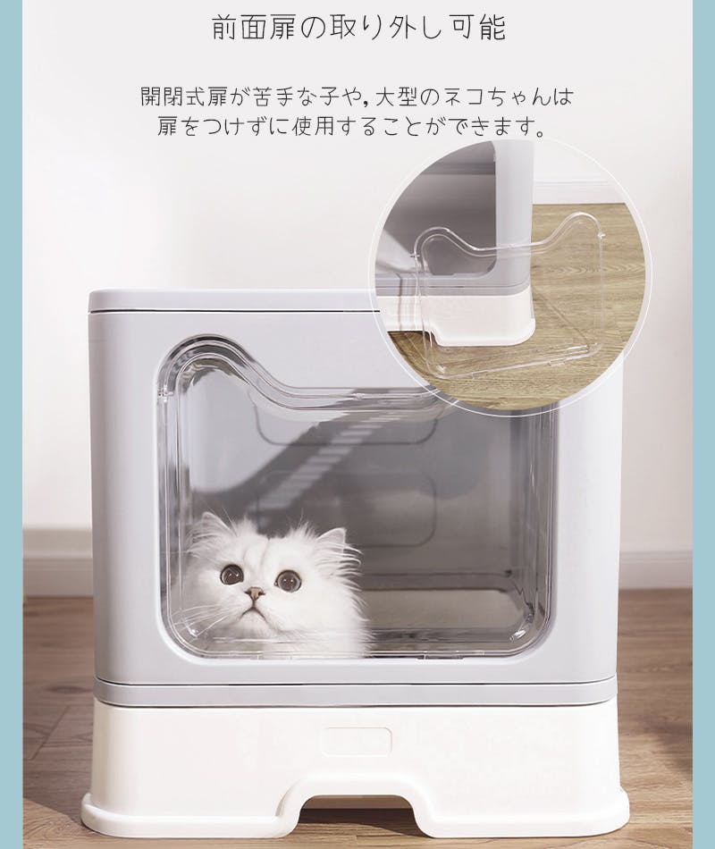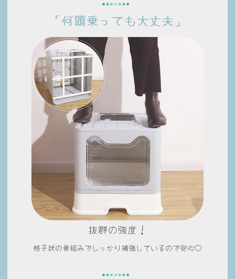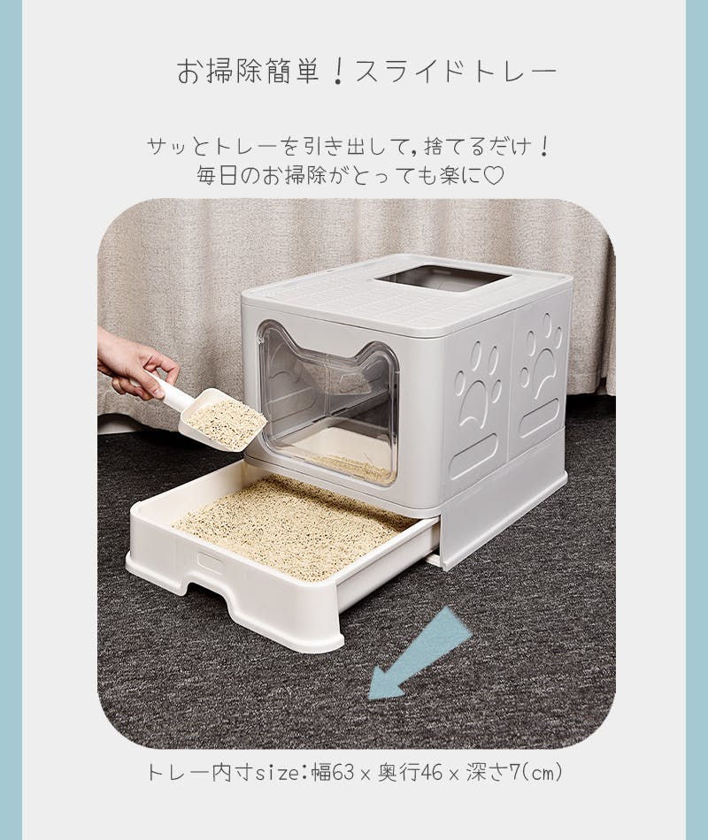 ・猫砂を入れたまま、下のスライドトレーを楽に引き出せ、お掃除簡単。・前から入って上から出る2ドアタイプのボックストイレ。天井部分はすのこ状になっており、足裏についた余分な砂を落とし、砂が飛び散りにくくお部屋が汚れにくいです。ドアは大きめサイズで出入りが楽にできる広々サイズで安心。前面扉は取り外して使用することもできます。・組み立て簡単。コンパクトに折りたたんで収納することもできます。