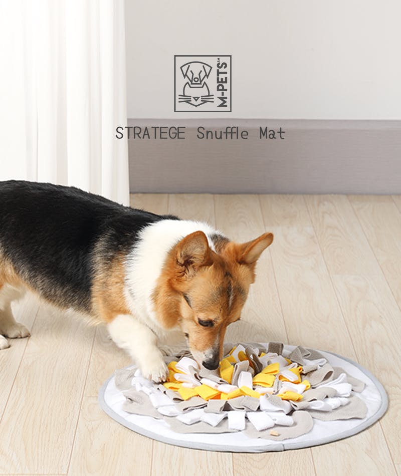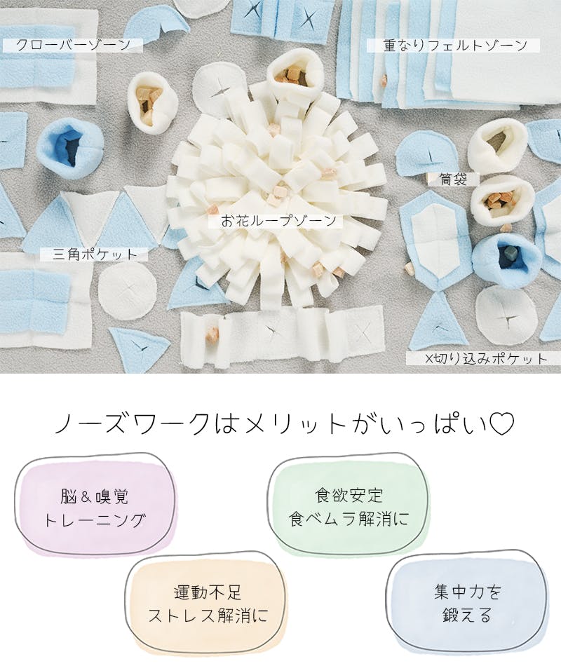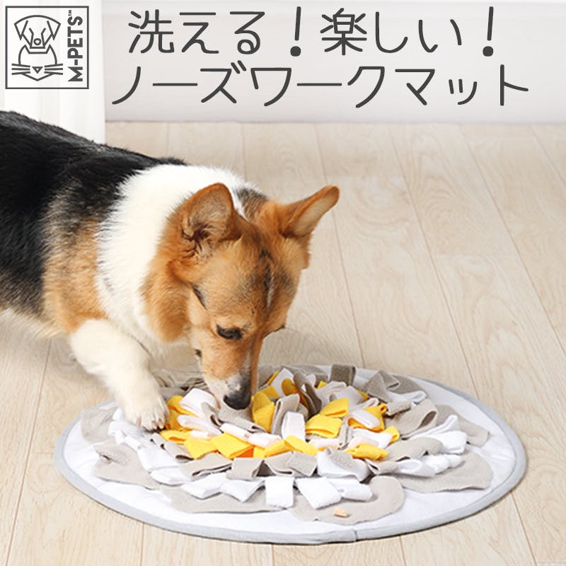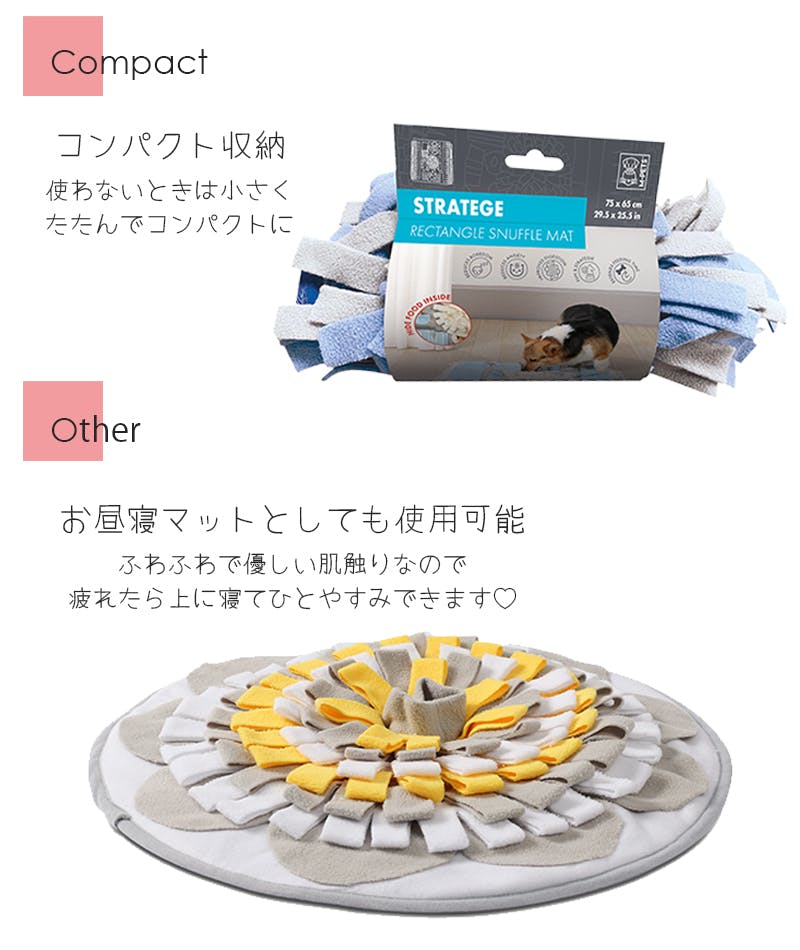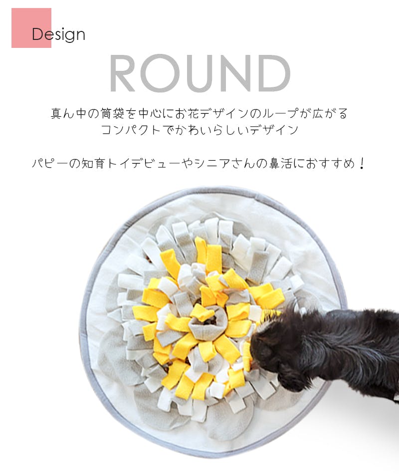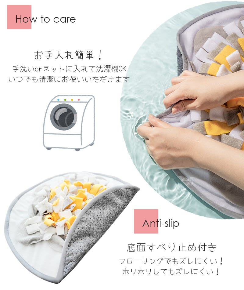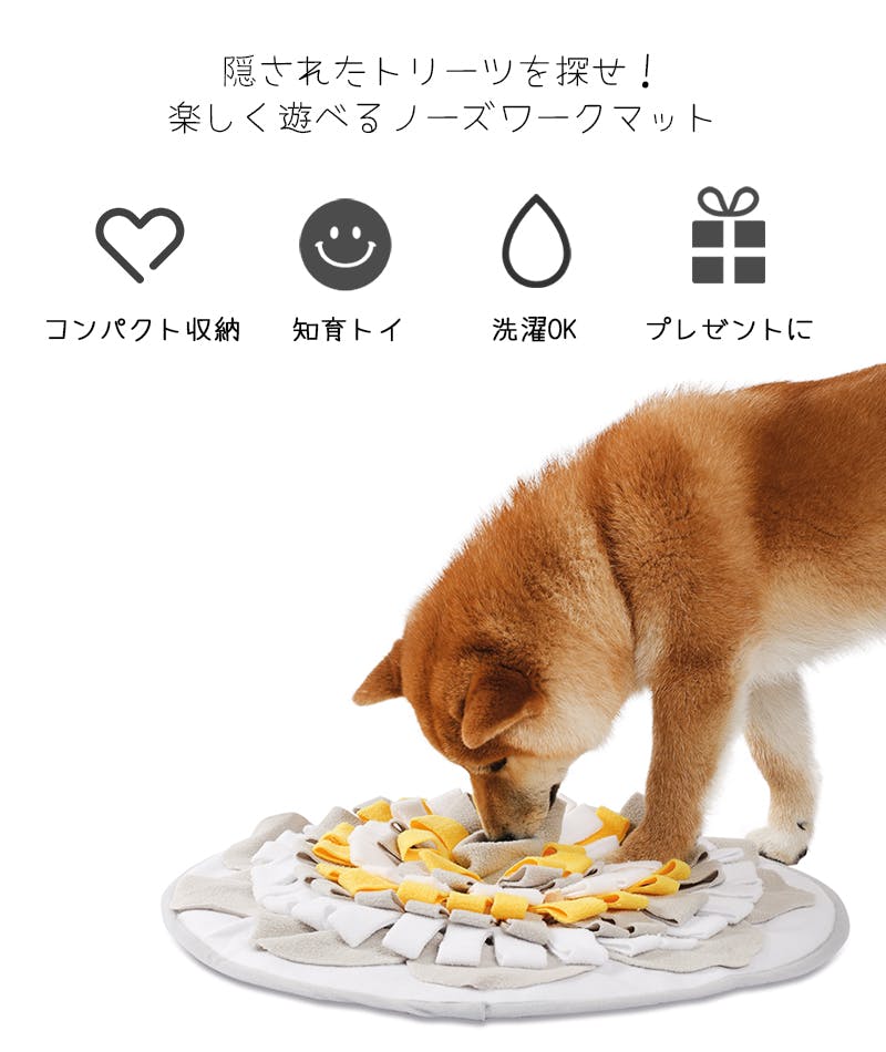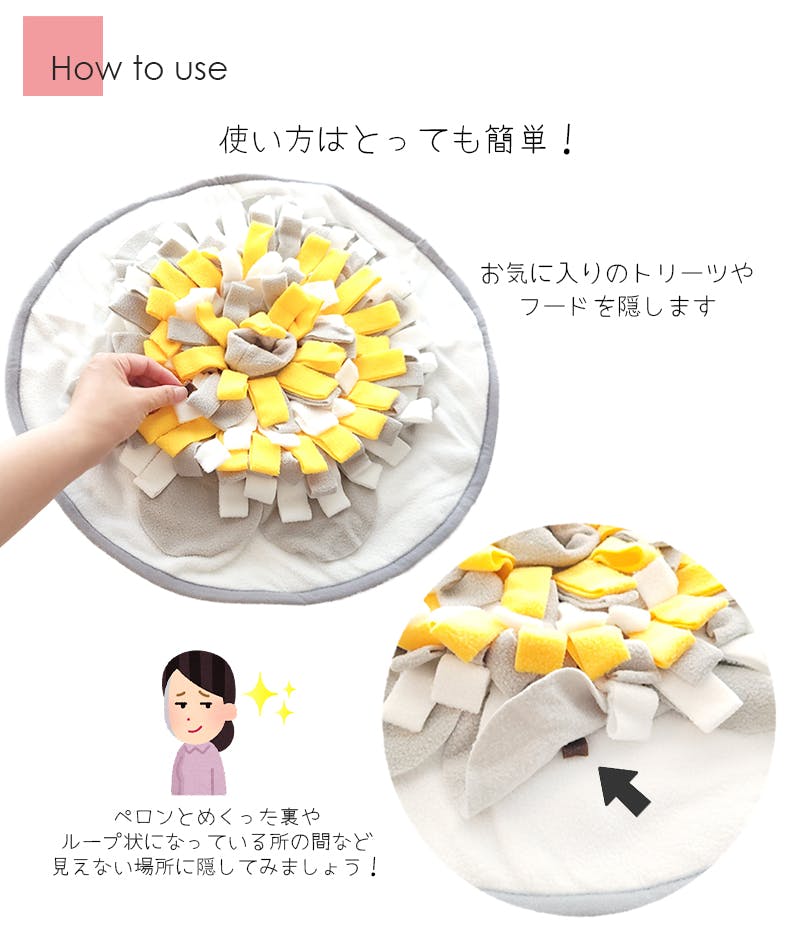 ・隠されたトリーツを本能を研ぎ澄まし発見する楽しい知育トイ。フリンジの裏や、ループの間など、見えない場所にお気に入りのトリーツやフードを隠し、おいしい香りを頼りに隠されたトリーツを探すお宝探し遊びが楽しめます。・フェルト素材なので、手洗い、または洗濯ネットに入れて洗濯が可能。簡単にお手入れができ、いつでも清潔にお使いいただけます。・底面すべり止め付きで、フローリングでもずれにくいです。