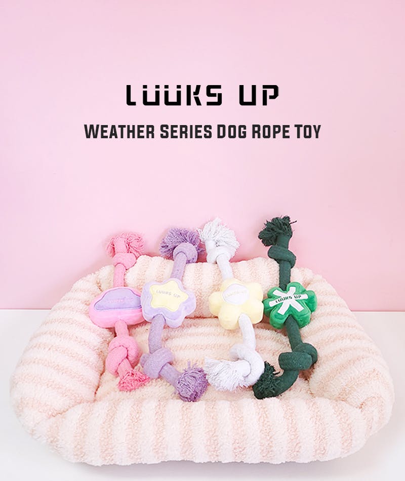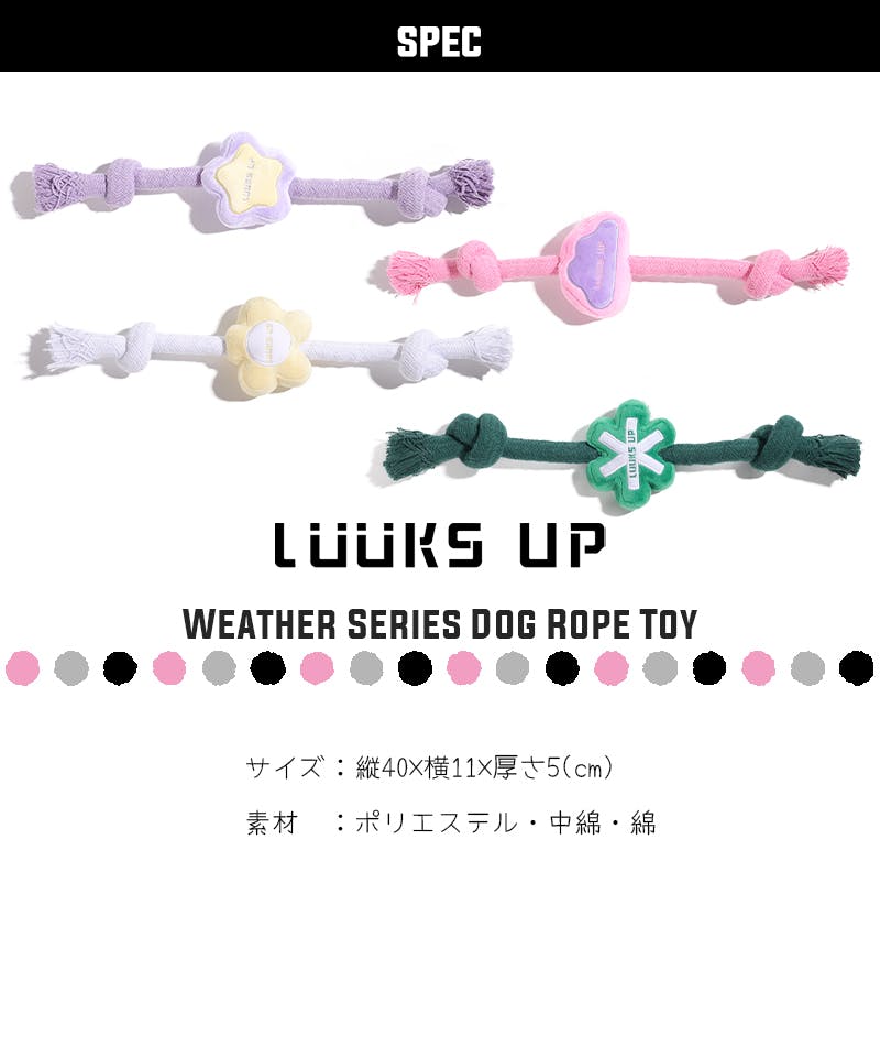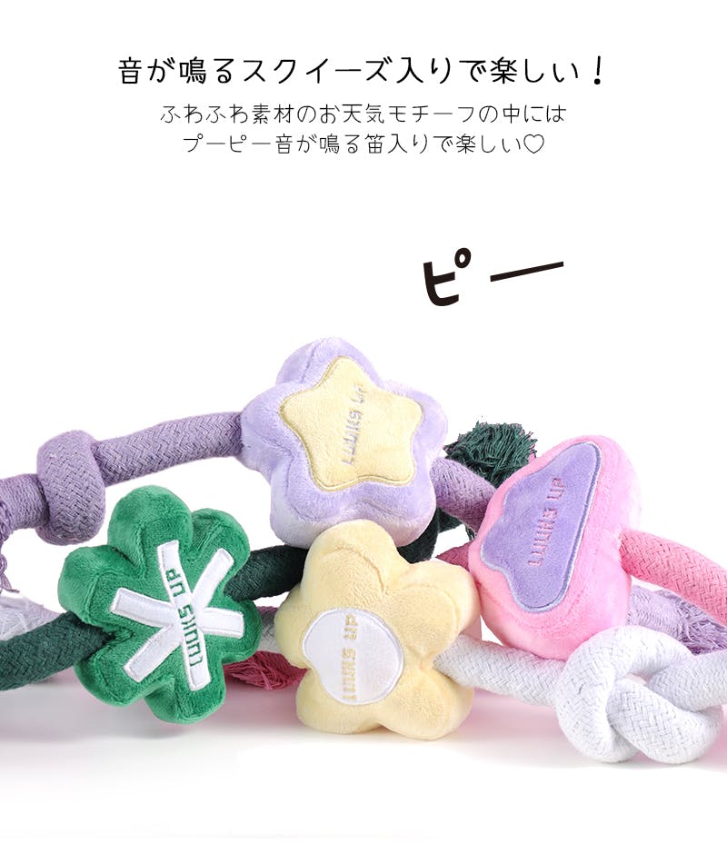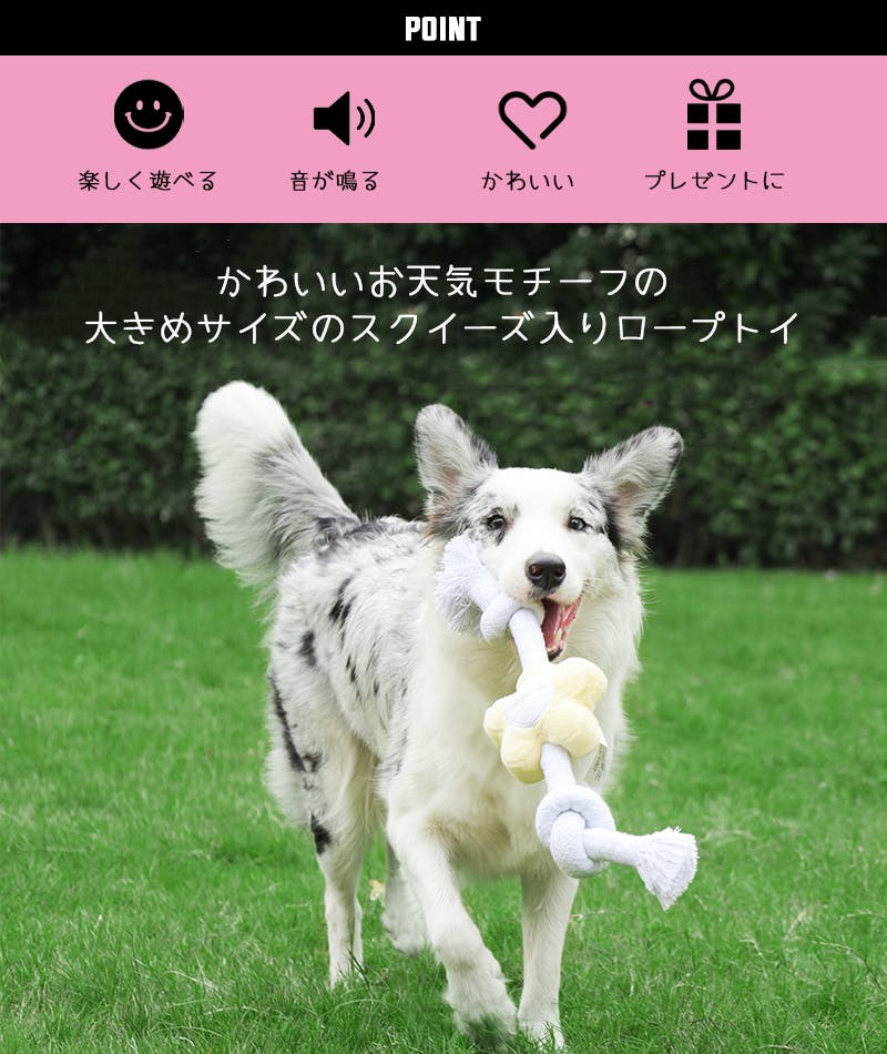 ・お天気モチーフからデザインされたカラフルでかわいいロープトイ。ロープは直径約2cmと太く丈夫!お天気モチーフのぬいぐるみ部分には、プープー音が鳴るスクィーズが入っており、音を鳴らしたり引っ張ったり振り回したりと楽しく遊べるかわいくて丈夫なロープトイ。・小型犬から中型犬におすすめ。・ロープ部分をガジガジ噛むことで歯磨き効果も期待できます。