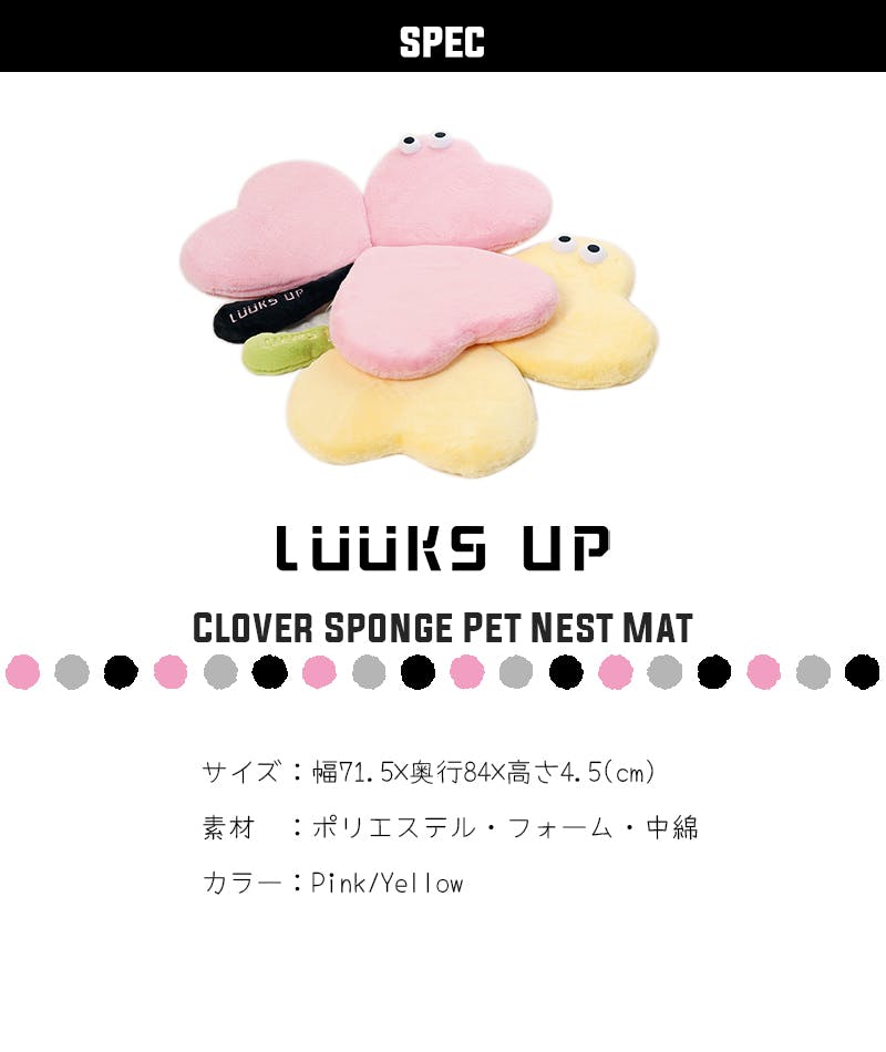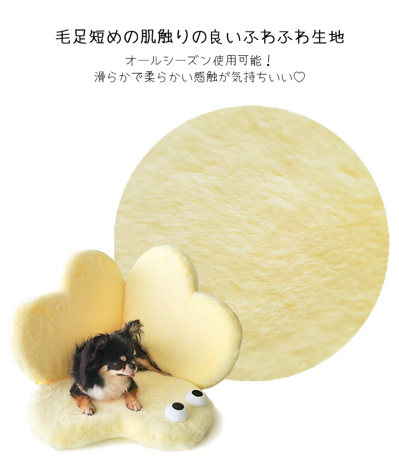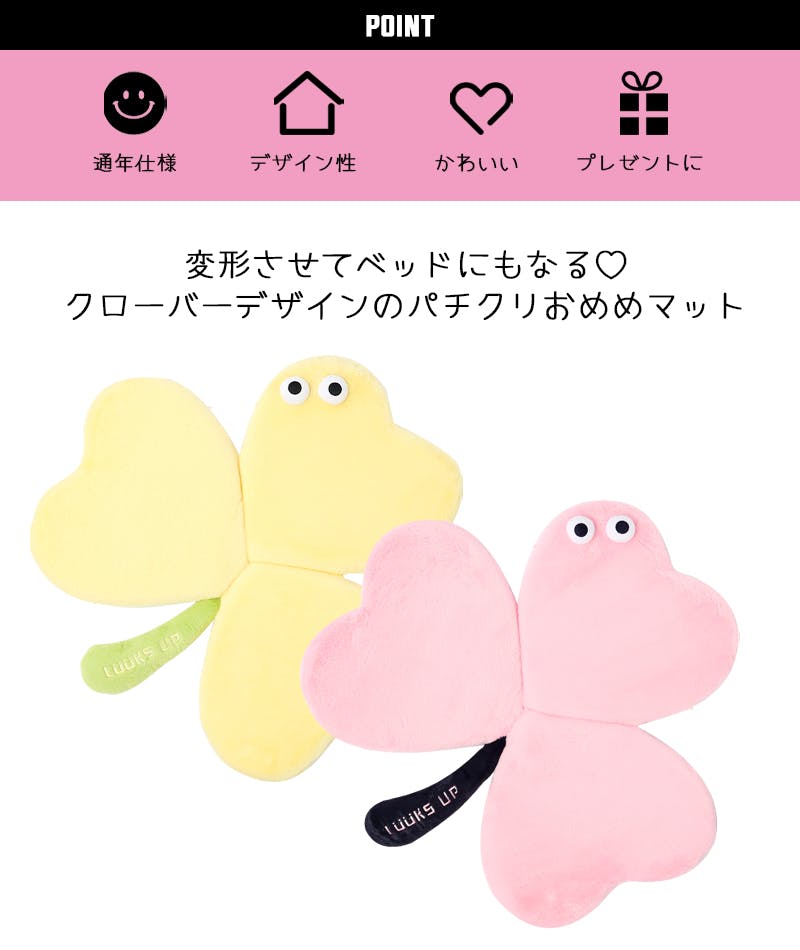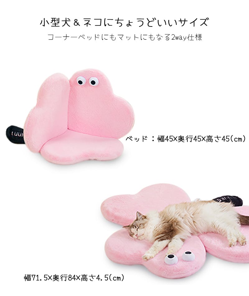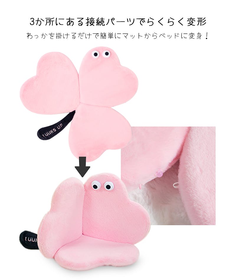 ・クリクリのお目目がワンポイント、クローバーデザインのポップなデザインマット。3箇所にある接続パーツでらくらく変形、わっかを掛けるだけで、簡単にマットからベッドに変身。・弾力のある中綿がたっぷり入った寝心地のいいふわふわマットです。・毛足短めの肌触りの良いふわふわ生地を使用。オールシーズン使用可能です。・厚さ約4.5cmの低めのマットで出入りスムーズ。パピーからシニアまで使いやすいです。