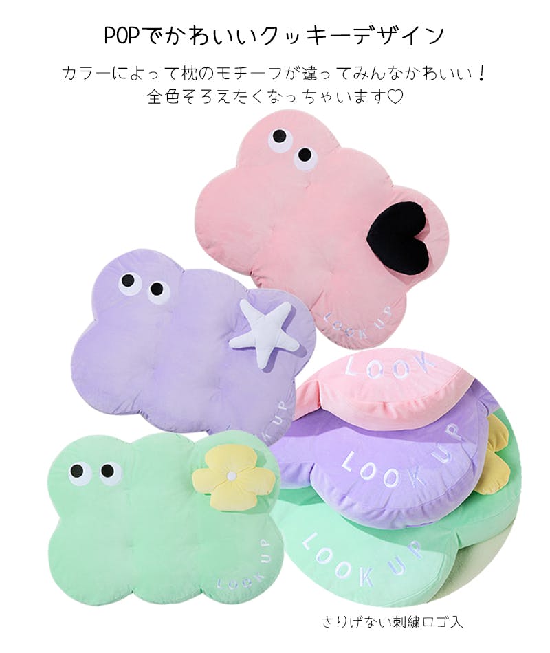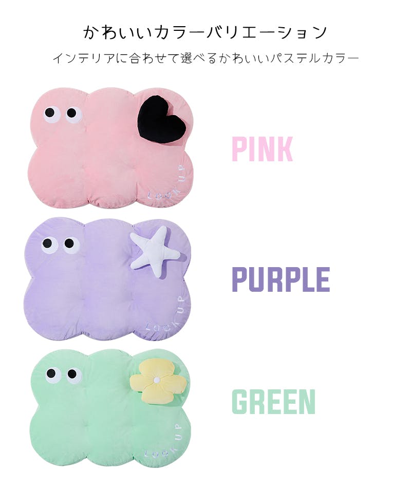 ・カラフルでポップなクッキーデザインのクッション。・クリクリのお目目がワンポイント。取り外し可能のモチーフは枕にもおもちゃにもなります。カラーによって枕のモチーフが違ってみんなかわいい。・弾力のある中綿がたっぷり入った寝心地のいいふわふわマットです。・毛足短めの肌触りの良いふわふわ生地を使用。オールシーズン使用可能です。