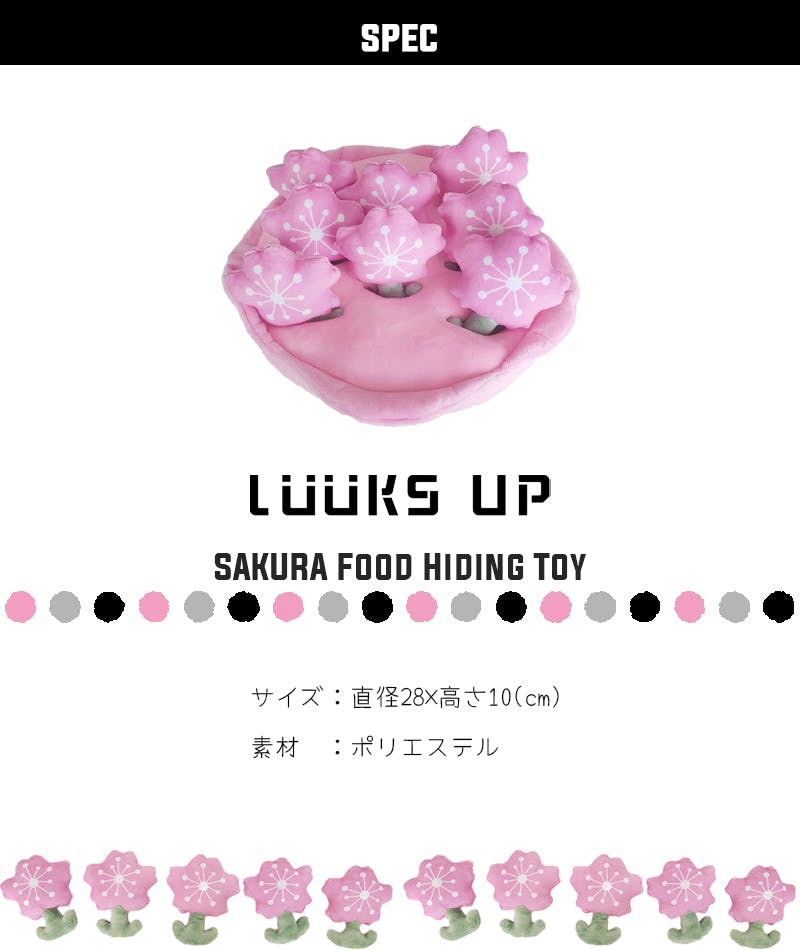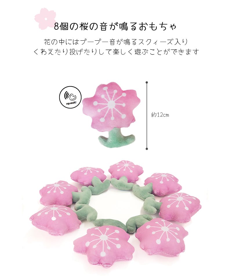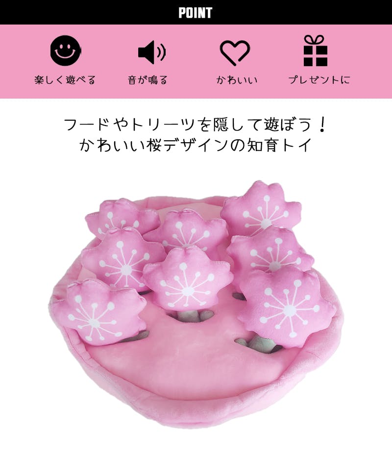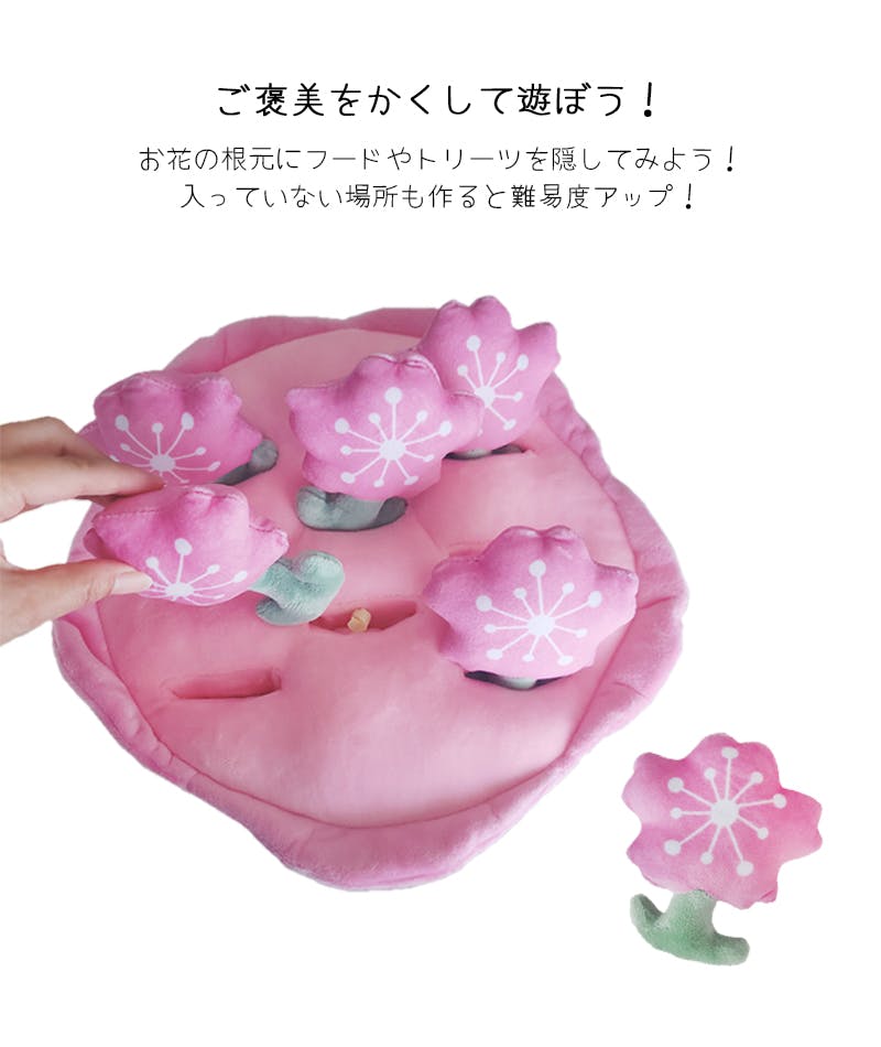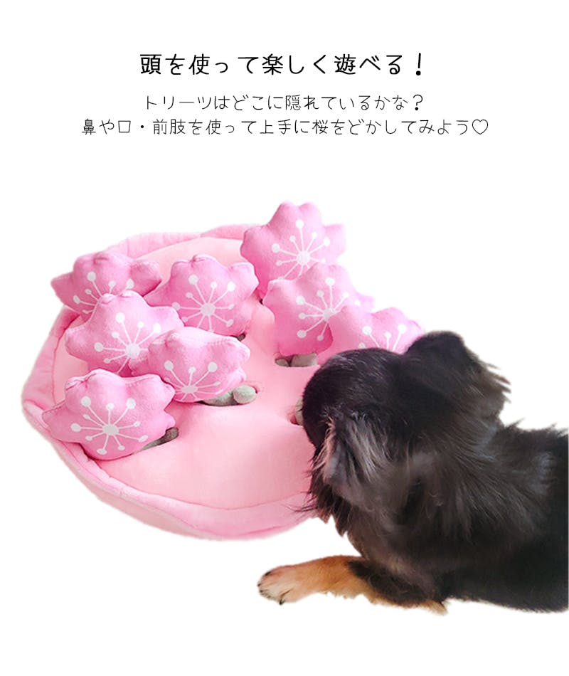 ・かわいい桜モチーフの知育トイ。穴の中に隠されたトリーツを頑張って探してみよう!入ってない場所も作ると難易度があがり、楽しく遊べます!・8個ある桜のお花の中にはプープー音が鳴るスクイーズが入っています。音を鳴らしたり投げたりと楽しく遊ぶことができます。・ふわふわでかわいい桜の本体は、滑らかな肌触りの生地で、簡単な汚れならさっと拭き取るだけで綺麗に。