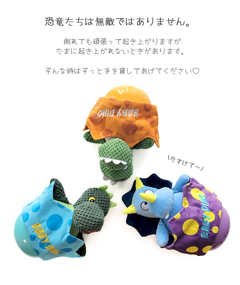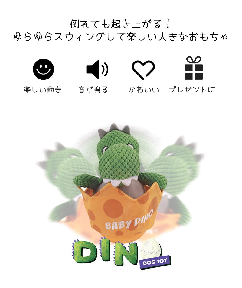 ・何度倒されても起き上がるかわいい恐竜ベビーデザインのおきあがりこぼし。ゆらゆら揺れる動きが楽しい!全力で戦っても起き上がるから飽きずにずっと楽しめます。大きめサイズだけど小型犬も楽しく遊べるおもちゃです。・卵の殻にはカシャカシャセロファン入り!頭の中にはプープー音が鳴るスクィーズ入りで楽しい仕掛けがいっぱい!ゆらゆら揺らして遊んだり、カシャカシャ音を鳴らして楽しんだり遊び方いろいろです。