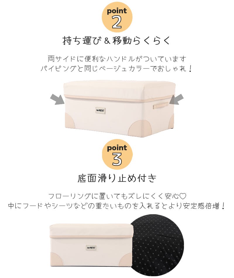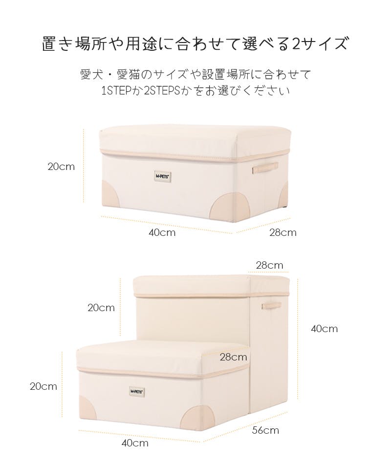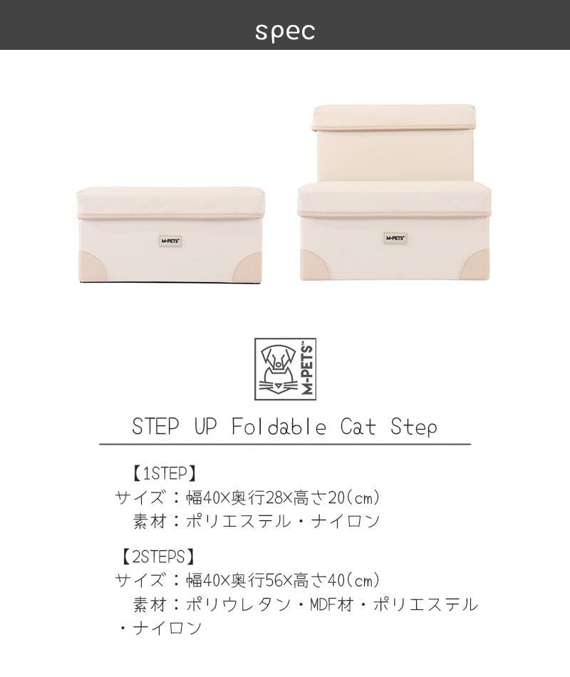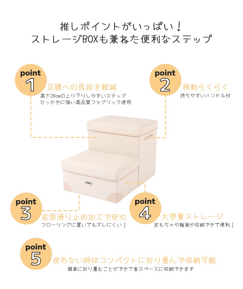 ・高さ20cmの上り下りしやすいステップで、足腰への負担を軽減。・ひっかきに強い高品質ファブリックを使用。・移動らくらく。持ち運びしやすいハンドル付き。・底面滑り止め加工で、フローリングに置いてもずれにくく安心。・ステップ内にお気に入りのおもちゃやトリーツをたっぷり収納することができとっても便利!・使わないときはコンパクトに折りたたんで収納することができます。
