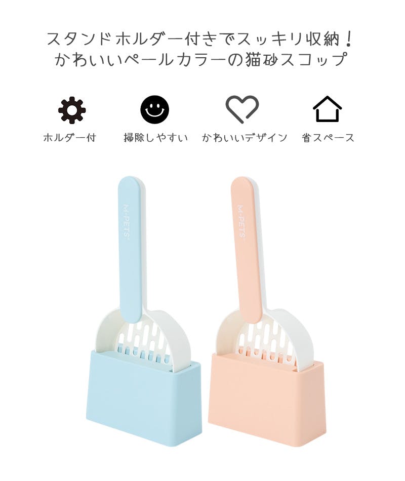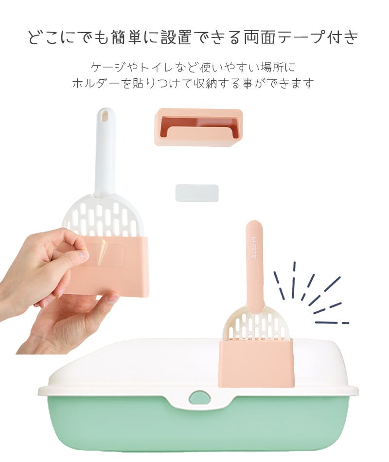 ・スタンドホルダー付きで省スペースにすっきり収納。かわいいペールカラーの猫砂スコップ。付属の両面テープを付けると、トイレやケージなどに貼り付けて収納することができます。・約15度の角度が付いており、固まった猫砂をすくいやすく、とっても使いやすいです。余分な砂が落ちやすく、固まりだけを除去することができます。・スコップもホルダーも丸洗いできるのでお手入れ簡単!いつでも清潔にお使いいただけます。