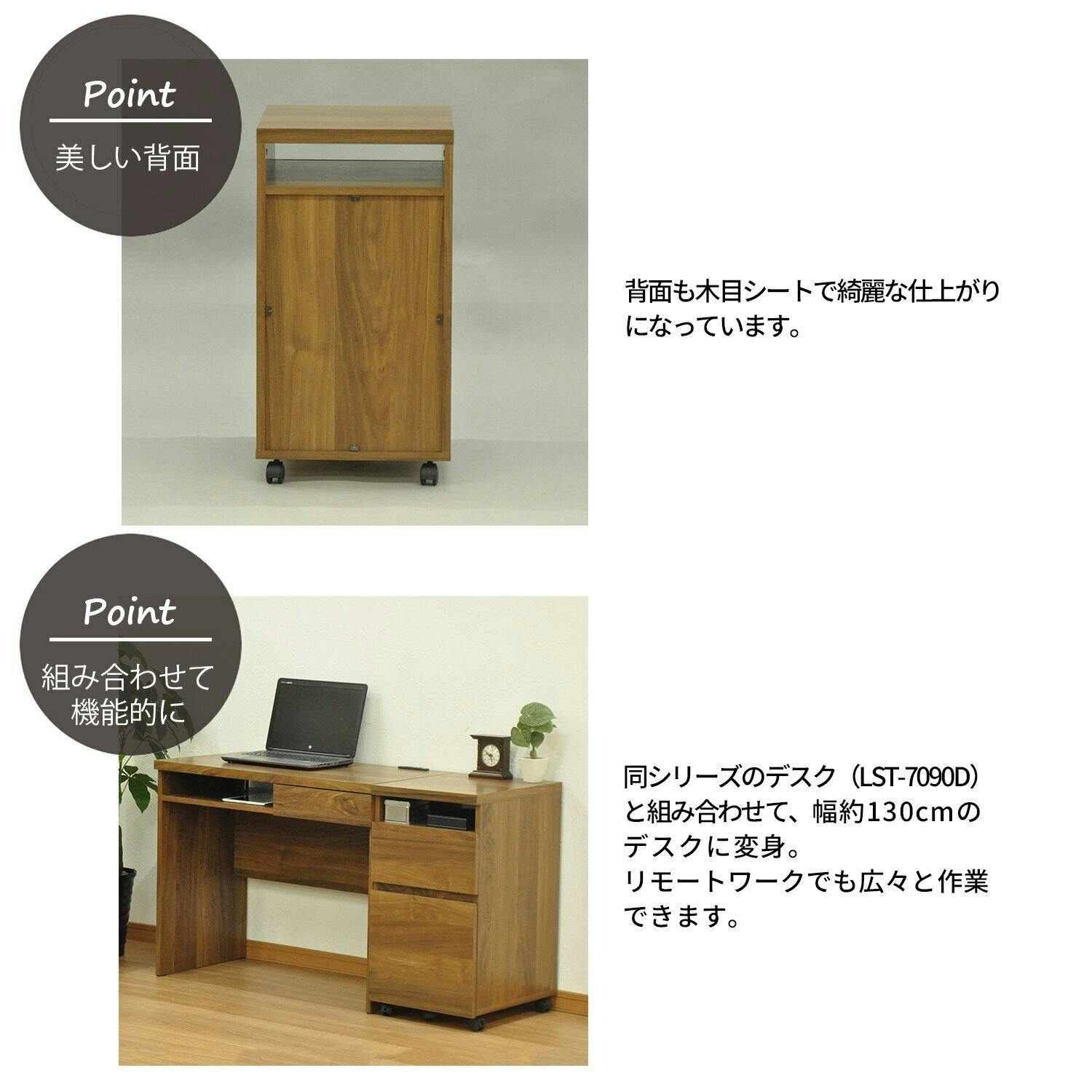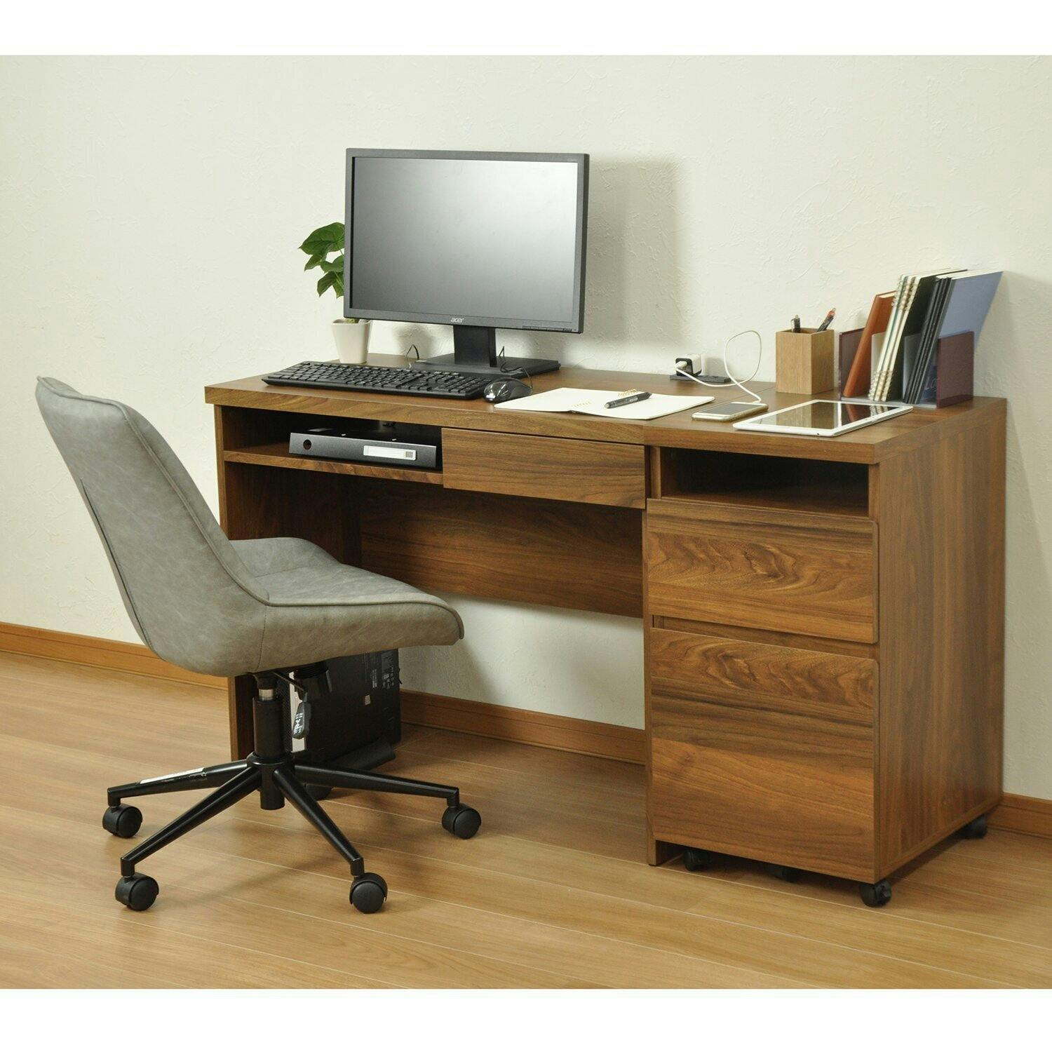 ●ワゴンの特徴●ウォールナットの木目や色味が和洋室にも相性が良く、北欧家具のようなシンプルモダンなデザインが高級感を増してくれます。●同じシリーズのデスクと組み合わせて並べると幅約130cmになります。作業スペースが広々と使っていただけます●オープンスペースにはPCやすぐに取り出しやすい物を置くのに大変便利です。●ストッパー付きのキャスターが付いていますので、移動もスムーズです。