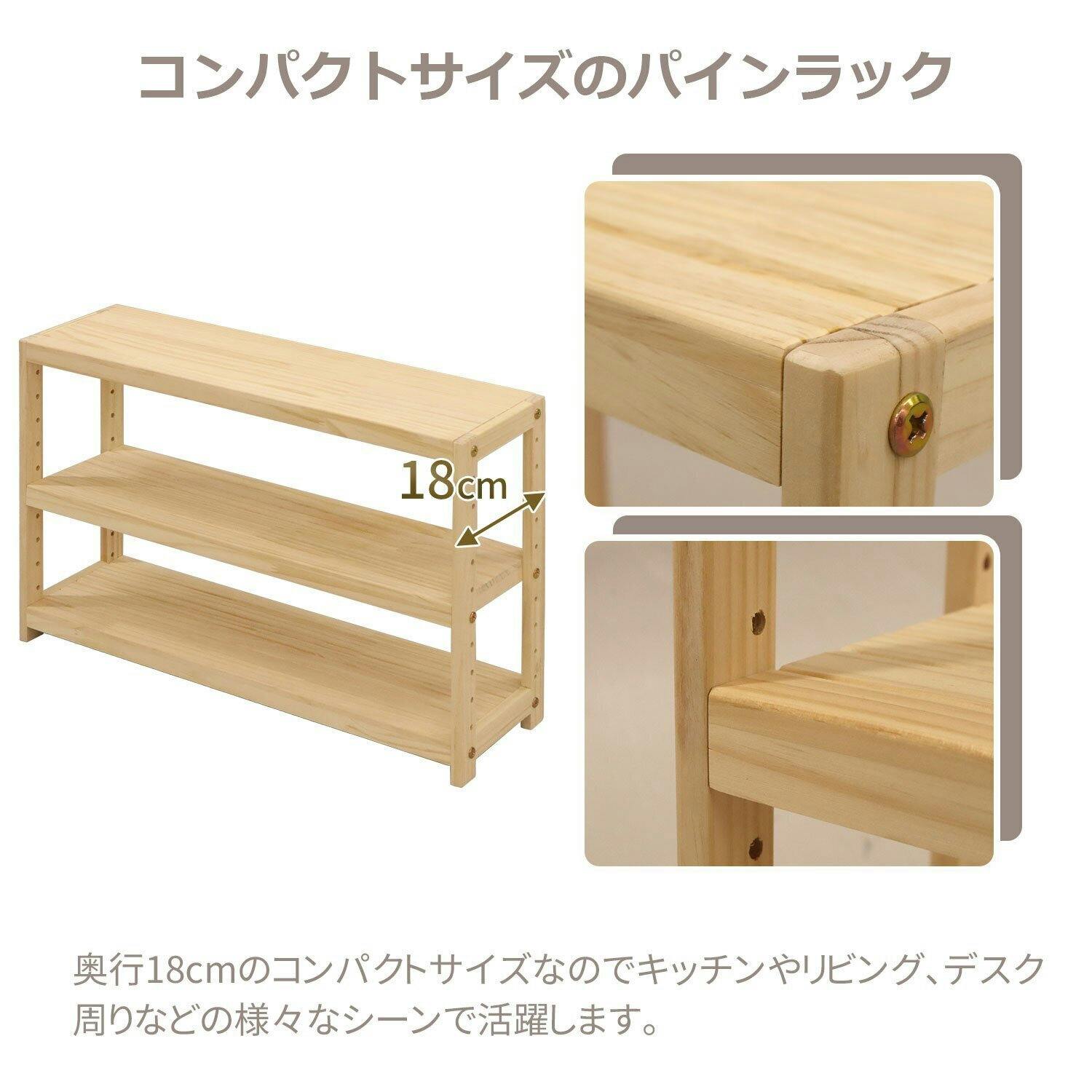 ●木の風合いを生かした、温かみのある自然な色合いのパインラックです。●シンプルデザインが部屋に馴染みやすく、スリムでコンパクトサイズなので、幅広いシーンで使用できます。●無塗装素材なので、お好みの色に塗り替えて使用するのもオススメです。●棚板は側板に3.2cm間隔でネジ穴が空いており、棚板をお好みの高さで固定することが出来ます。