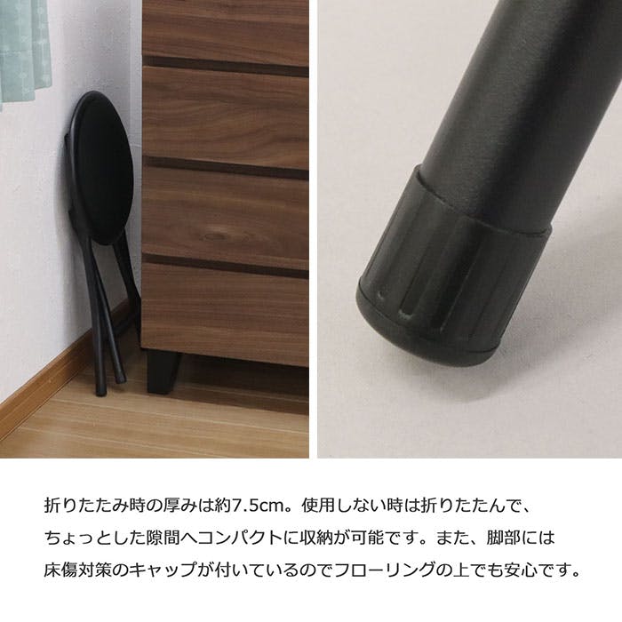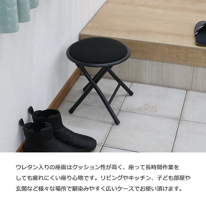●座面の高さは約30.5cmと低めのため、玄関先での使用やガーデニング作業のお供としてもオススメです。●折りたたみ時の厚みは約7.5cm。使用しない時は折りたたんで、ちょっとした隙間へコンパクトに収納が可能です。●脚部には床傷対策のキャップが付いています。●座面の素材は、サラッとした肌触りのポリエステル素材。ウレタン入りの座面は座布団などを敷くことなく、柔らかな座り心地でお使い頂けます。