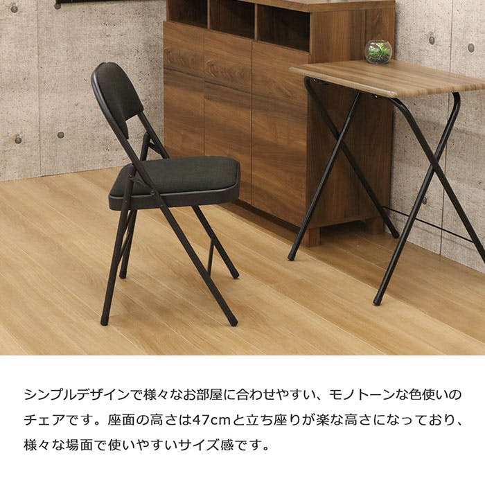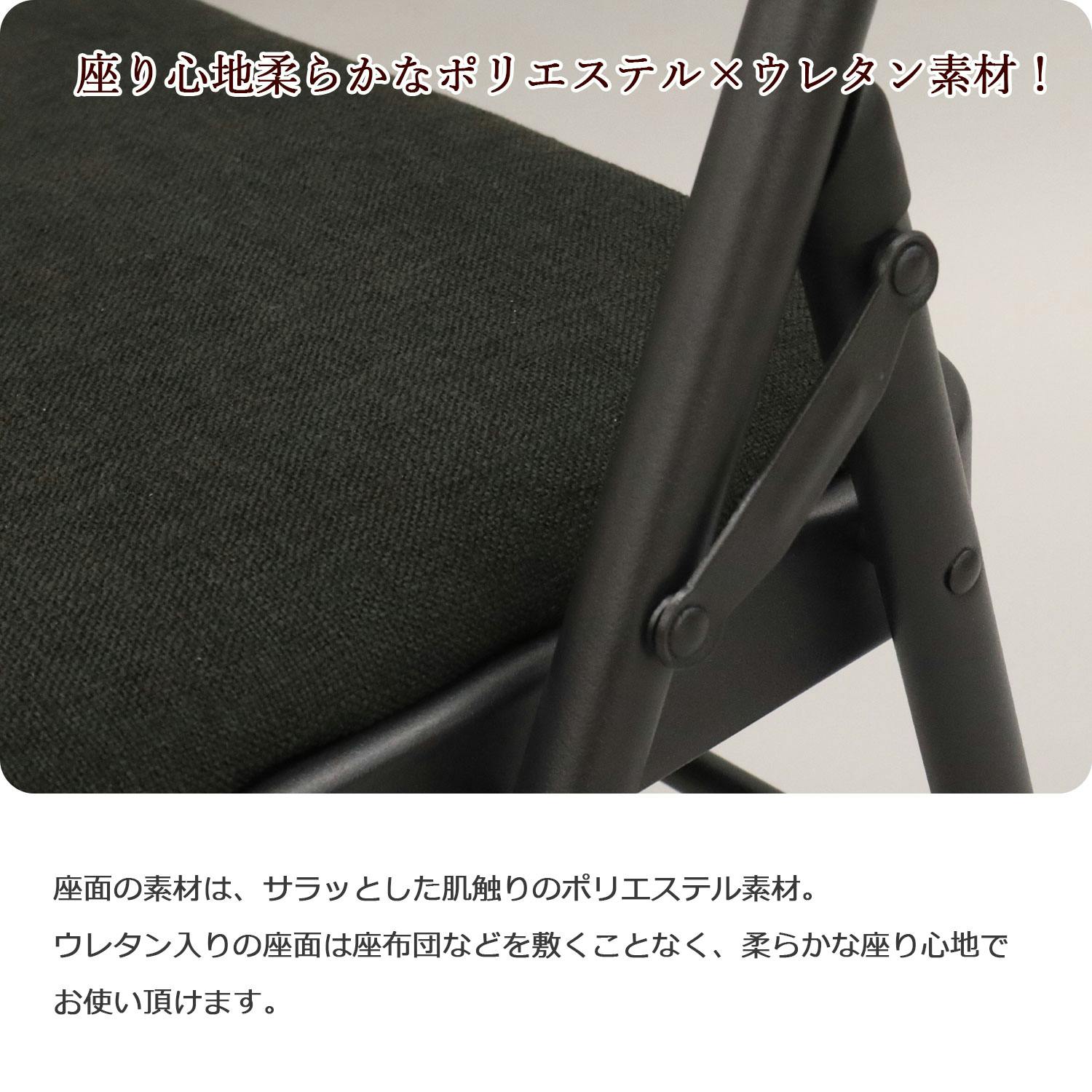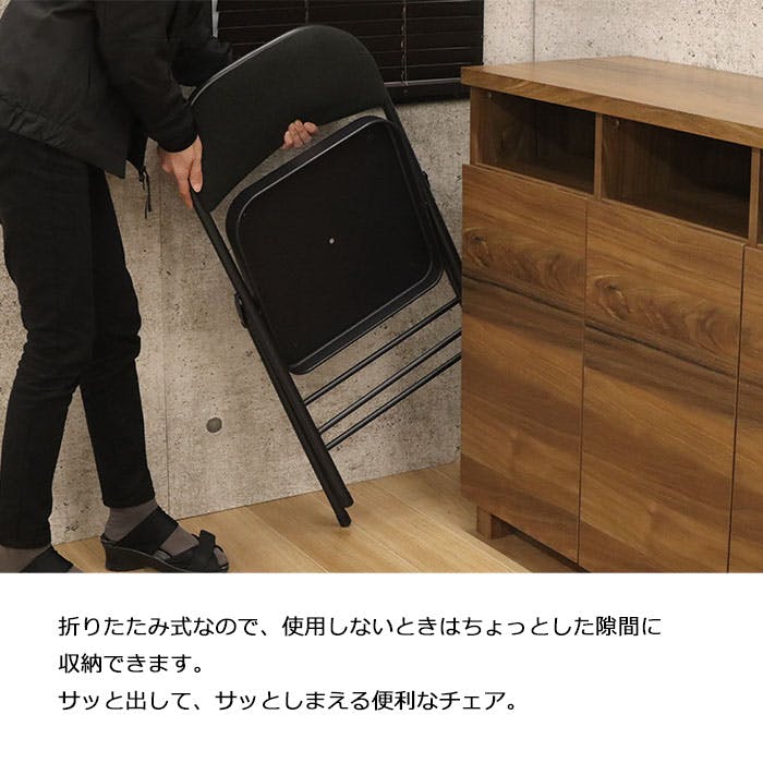 ●折りたたみ時の厚みは約11cm。使用しない時は折りたたんで、ちょっとした隙間へコンパクトに収納が可能です。●ウレタン入りの座面・背面はクッション性が高く、座って長時間作業していても疲れにくい座り心地です。●脚部には床傷対策のキャップが付いています。●会議用チェアとしては勿論、リビングやキッチンなど家庭でのご使用にもオススメです。●座面の素材は、サラッとした肌触りのポリエステル素材。