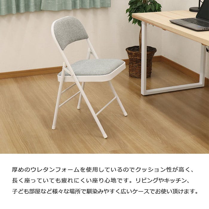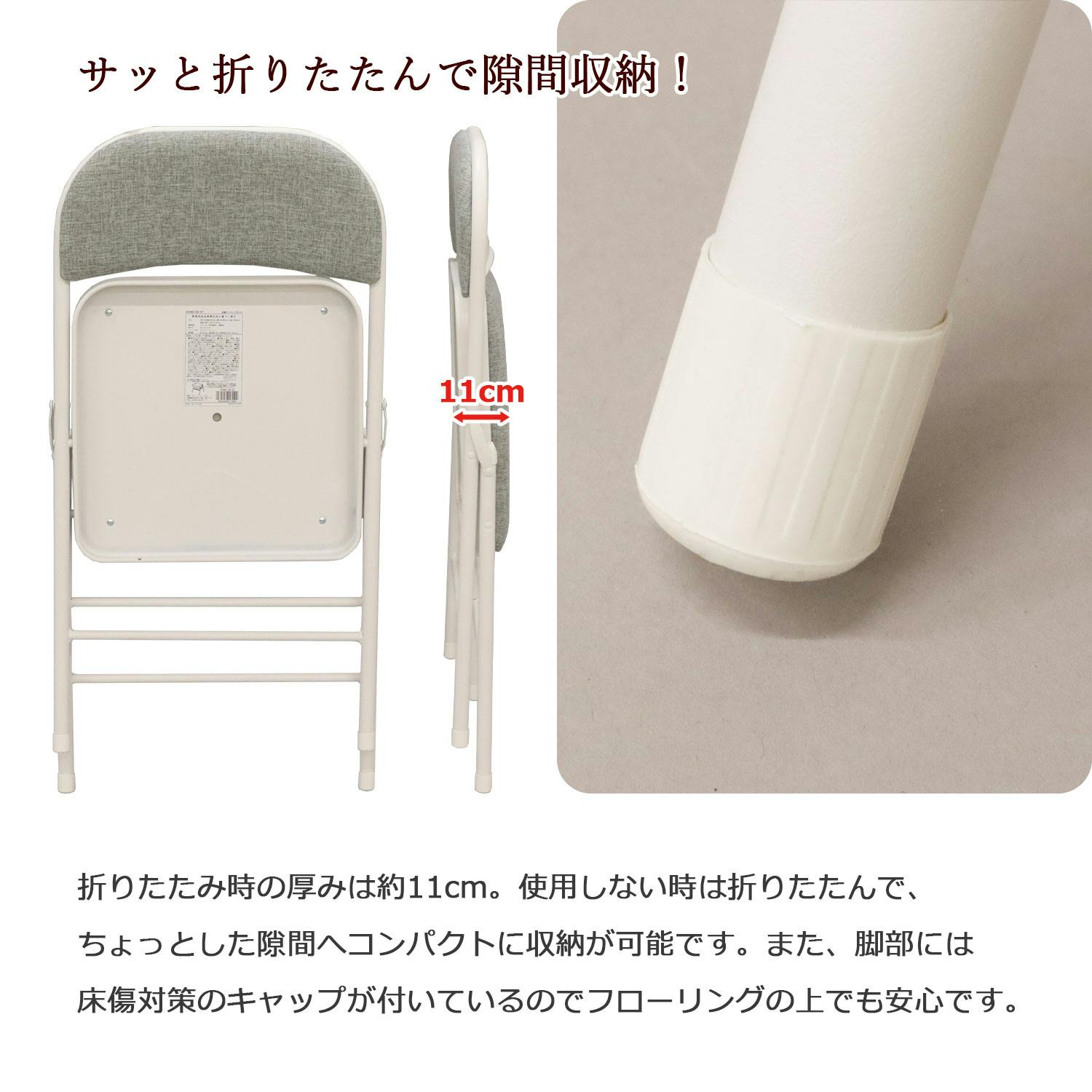 ●折りたたみ時の厚みは約11cm。使用しない時は折りたたんで、ちょっとした隙間へコンパクトに収納が可能です。●ウレタン入りの座面・背面はクッション性が高く、座って長時間作業していても疲れにくい座り心地です。●脚部には床傷対策のキャップが付いています。●会議用チェアとしては勿論、リビングやキッチンなど家庭でのご使用にもオススメです。●座面の素材は、サラッとした肌触りのポリエステル素材。