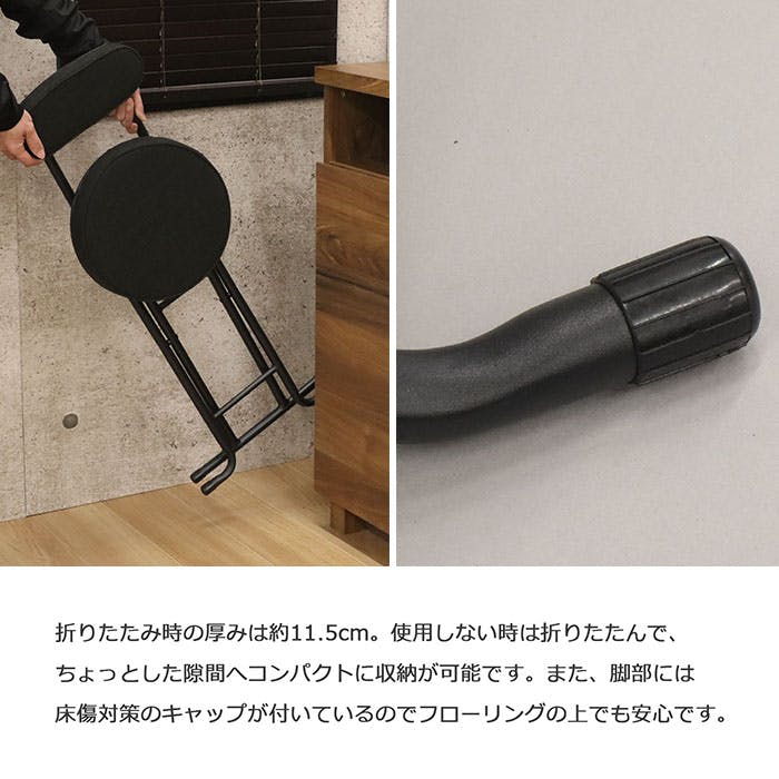 ●折りたたみ時の厚みは約11.5cm。使用しない時は折りたたんで、ちょっとした隙間へコンパクトに収納が可能です。●厚めのウレタンフォームを使用しているのでクッション性が高く、長く座っていても疲れにくい座り心地です。●脚部には床傷対策のキャップが付いています。●シンプルデザインなパイプ椅子のため、リビングやキッチン、子ども部屋など様々な場所で馴染みやすく広いケースでお使い頂けます。
