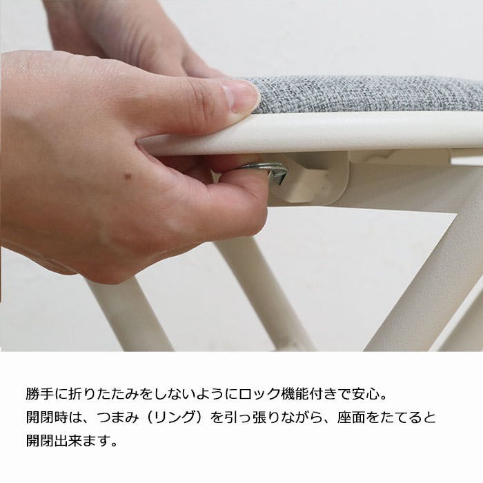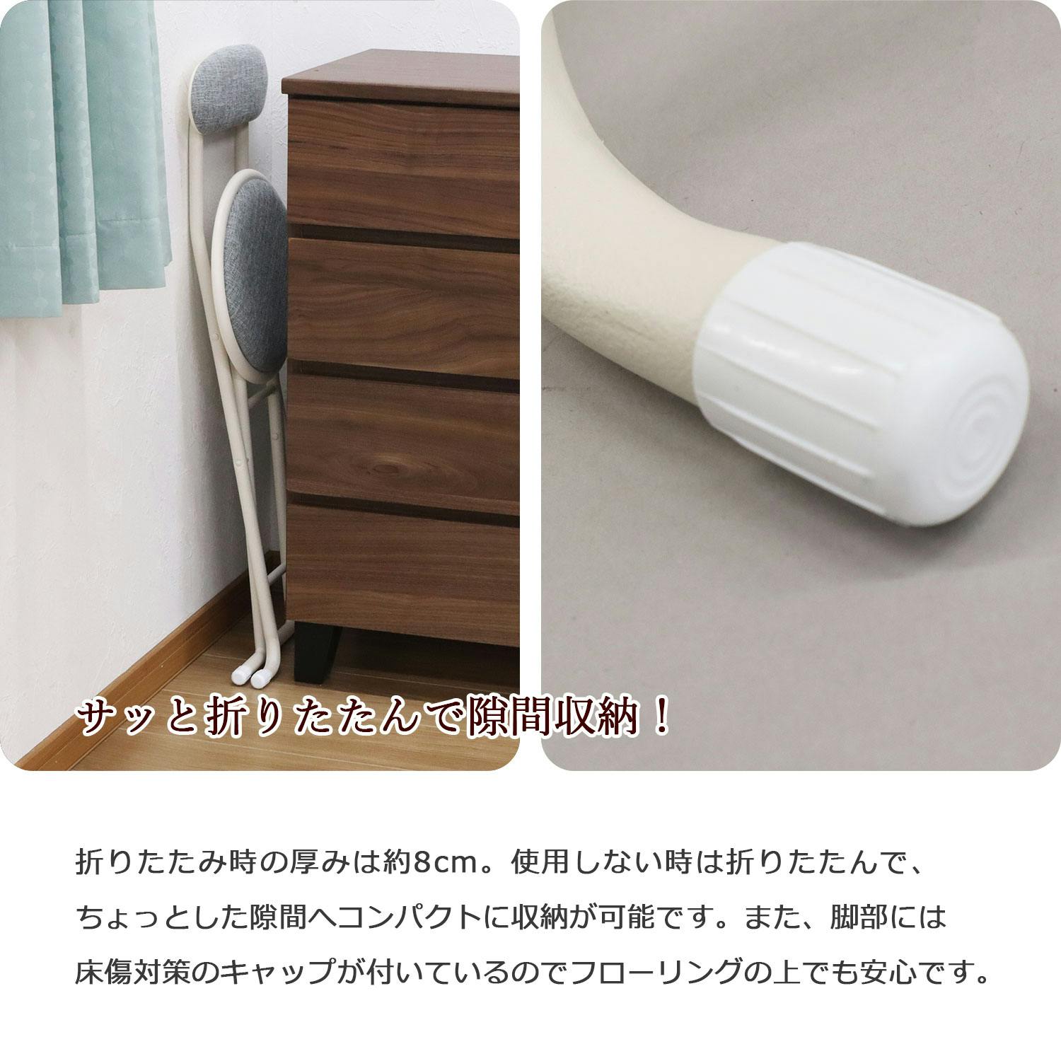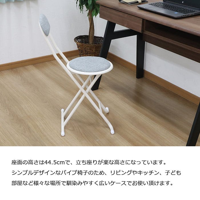 ●折りたたみチェア(ファブリック生地)の特徴●折りたたみ時の厚みは約8cm。使用しない時は折りたたんで、ちょっとした隙間へコンパクトに収納が可能です。●脚部には床傷対策のキャップが付いています。●シンプルデザインなパイプ椅子のため、リビングやキッチン、子ども部屋など様々な場所で馴染みやすく広いケースでお使い頂けます。