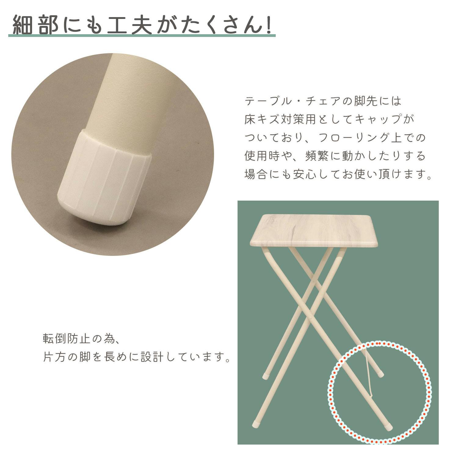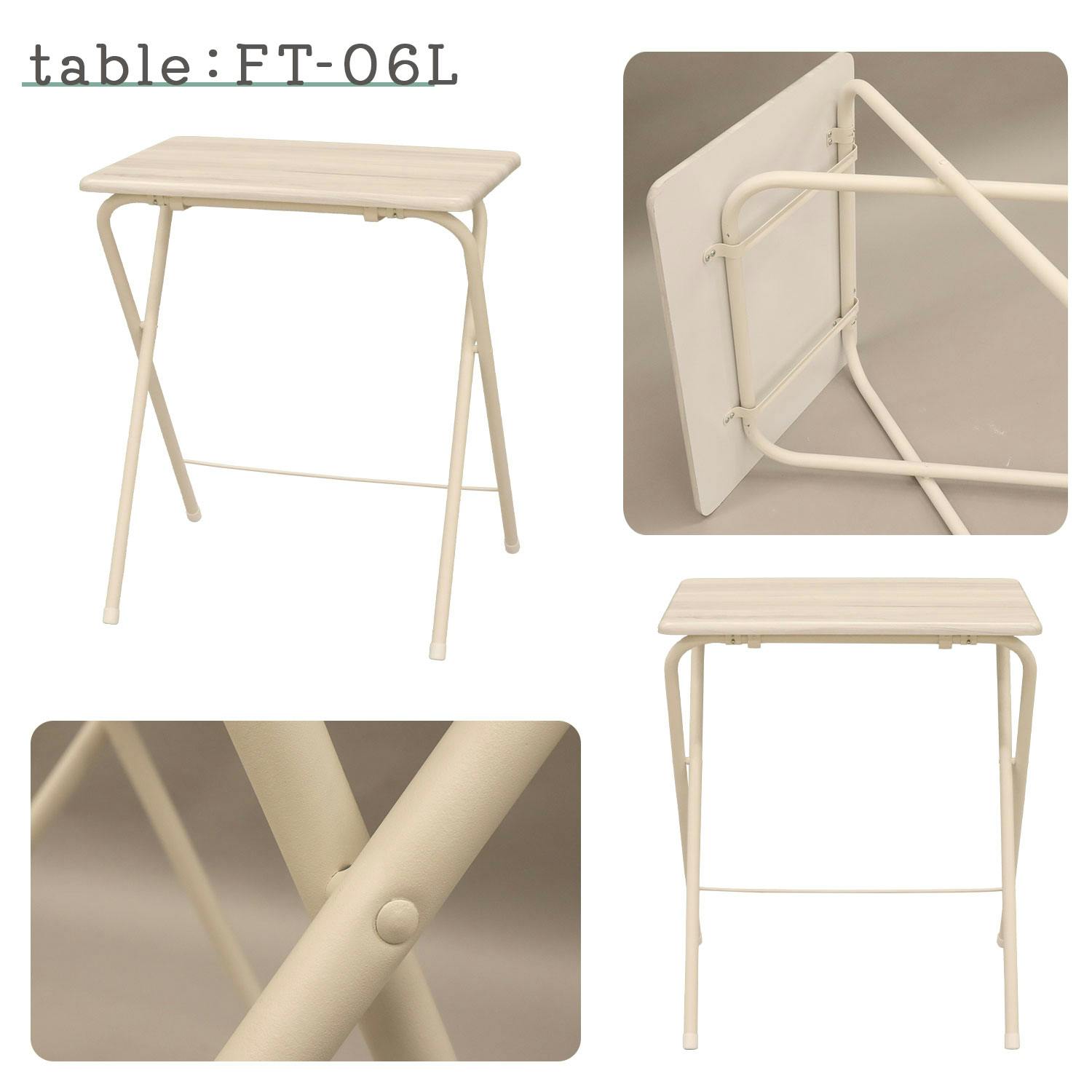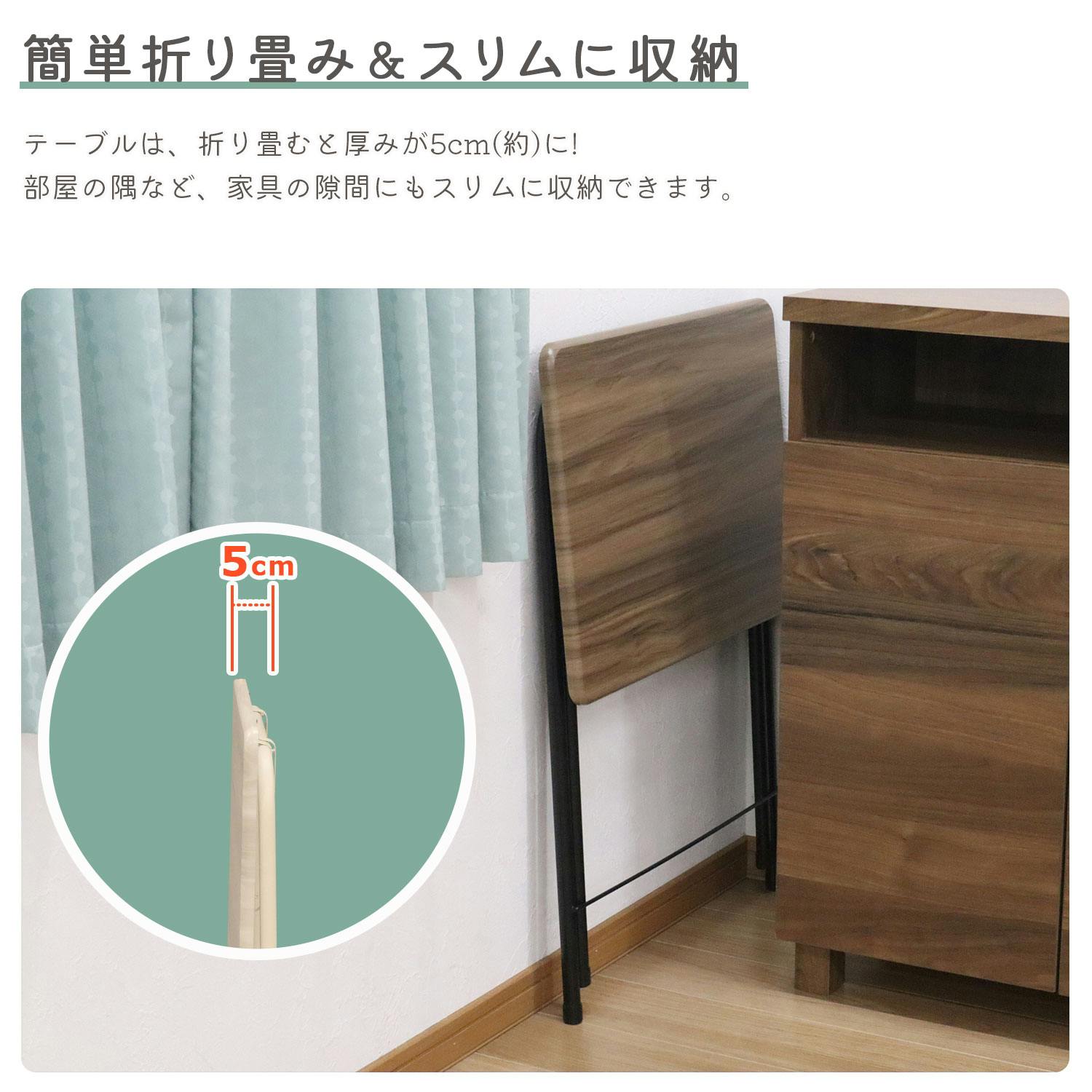 ●ちょっとした作業やデスクワークなど様々なシーンで活躍できます。●折畳時の厚さは、約5cmとスリムでコンパクト。使わない時は、隙間に収納が可能。●テーブルは約5kgと軽量なので、持ち運びが楽々。●耐荷重は天板約30kg。PCやミシンなどを置いて作業するのに最適です。●木目調天板×アイアンの組合せがヴィンテージスタイルを演出。
