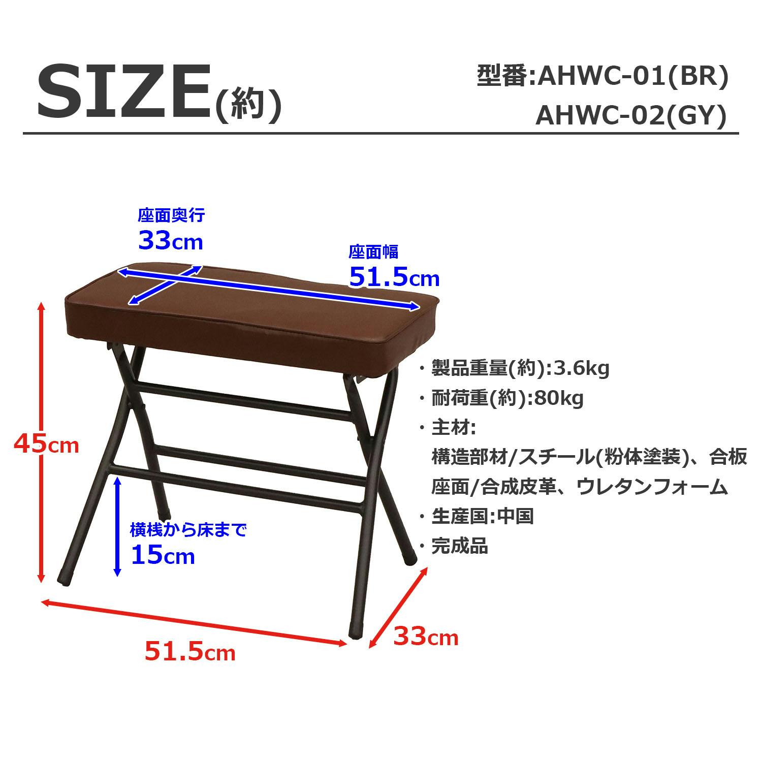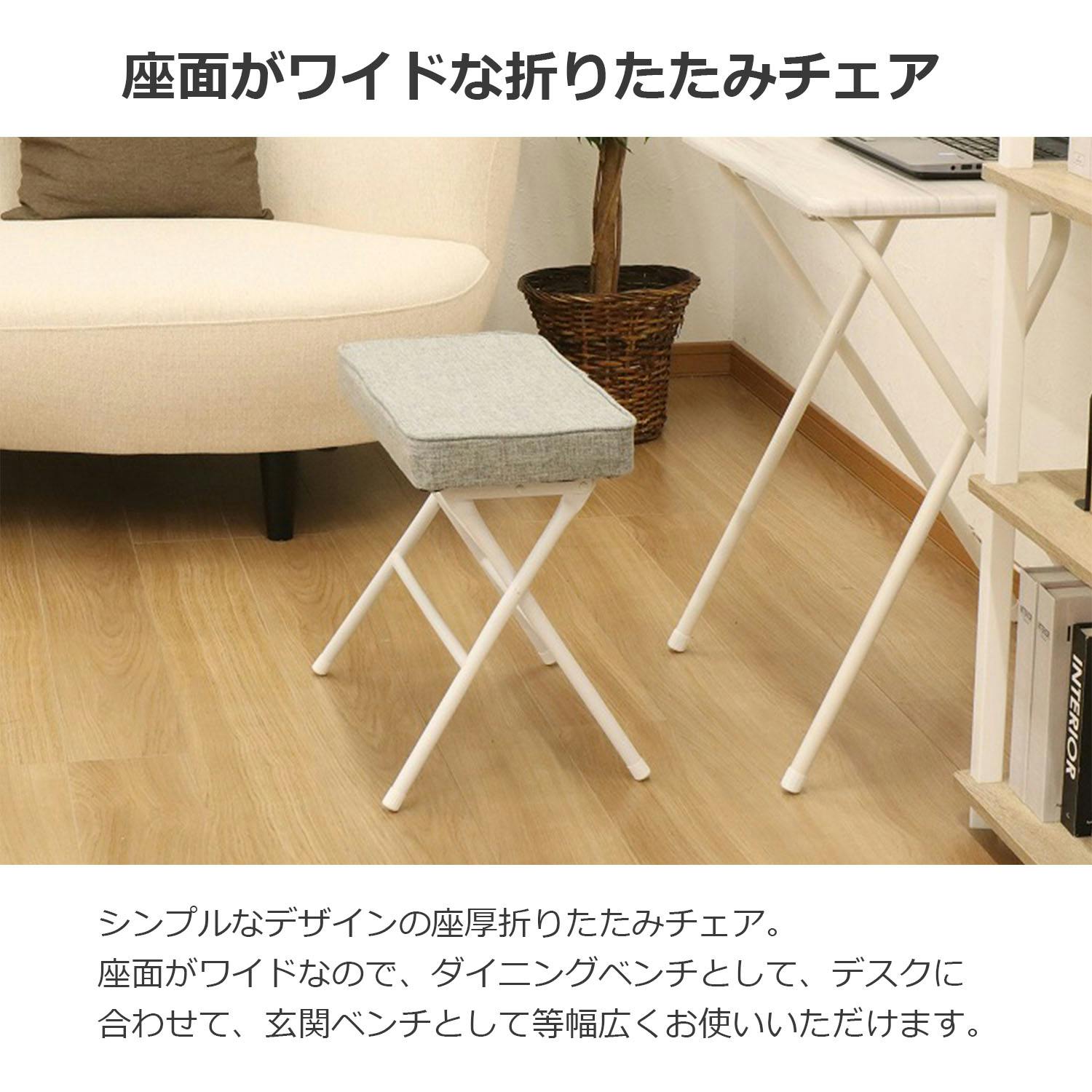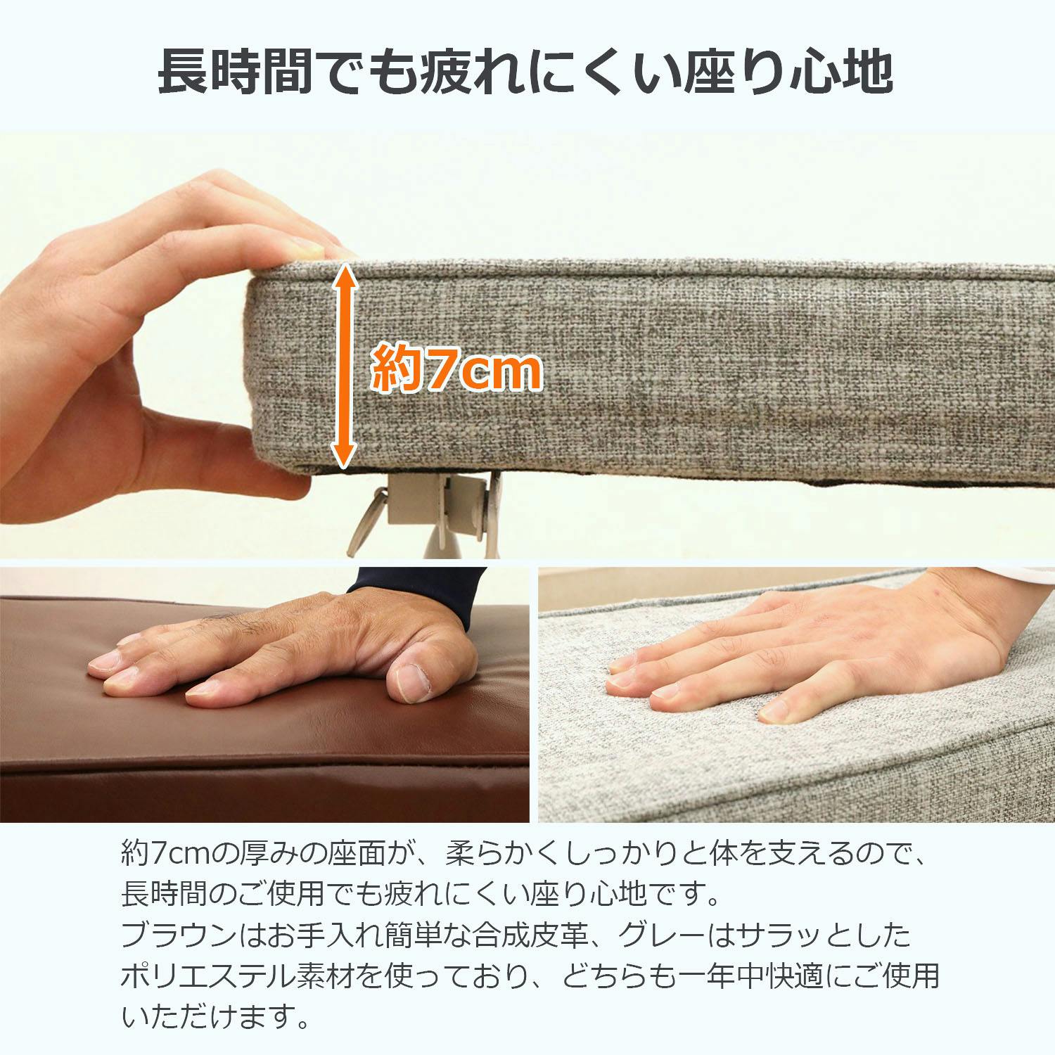 ●シンプルなデザインの座厚折りたたみチェアです。●座面の幅が約51.5cmとワイドなので、ダイニングベンチとして、デスクに合わせて、玄関ベンチとしてなど幅広くお使い頂けます。●厚みが約7cmある座面が、柔らかくしっかりと体を支えるので、長時間のご使用でも疲れにくい座り心地です。●ブラウンはお手入れ簡単な合成皮革、グレーはサラッとしたポリエステル素材を使っており、どちらも快適にご使用頂けます。