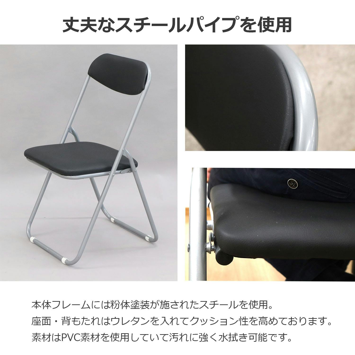 ●ベーシックなデザインで使う場所を選びません。●本品は折りたたむことが可能で、使わない時も場所を取らず収納できます。急な来客時もサッと取り出せます。●座面・背もたれはウレタンを入れてクッション性を高めております。素材はPVC素材を使用していて汚れに強く水拭き可能です。●脚には床にキズを付けにくくするキャップが付いております。●折りたたみ時の厚みは7.2cmになり、複数収納時もかさばらず省スペース。●一脚あたりの商品重量は4.5kg。
