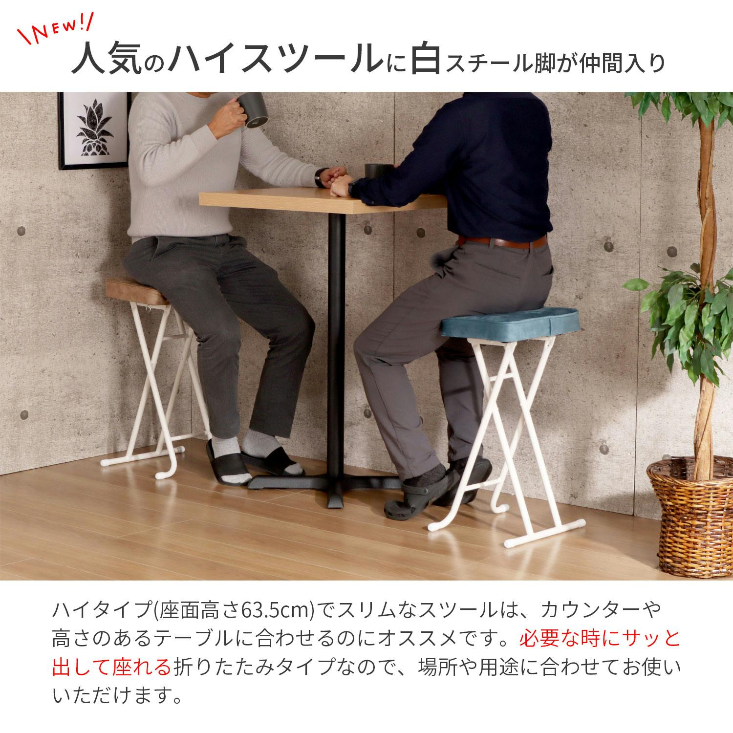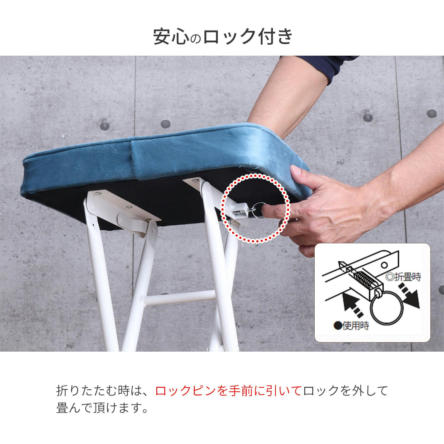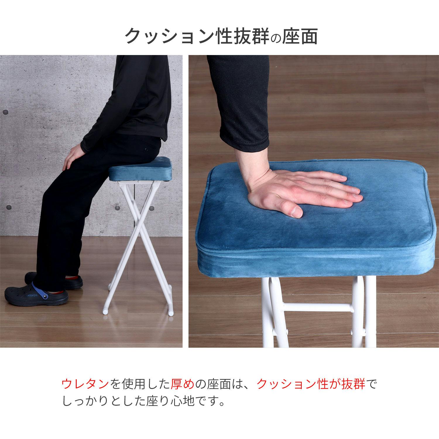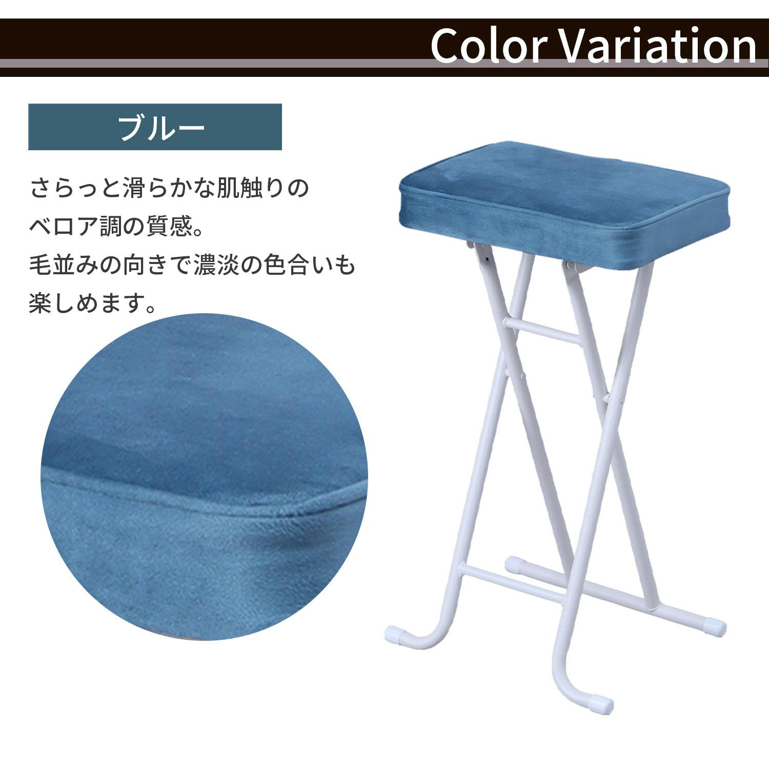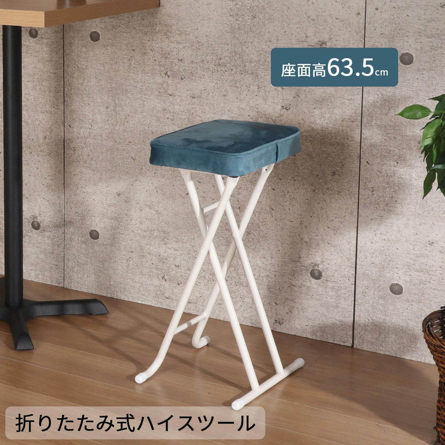 ●ハイタイプ(座面高さ63.5cm)でスリムなスツールは、カウンターや高さのあるテーブルに合わせるのにオススメです。●ブルーの座面は、サラッとした肌触りのベロア調の質感です。●ウレタンを使用した厚めの座面は、クッション性が抜群でしっかりとした座り心地です。●脚部には床傷対策のキャップが付いています。●折りたたみ時の厚みは約11.5cm。使用しない時は折りたたんで、隙間に収納が可能です。