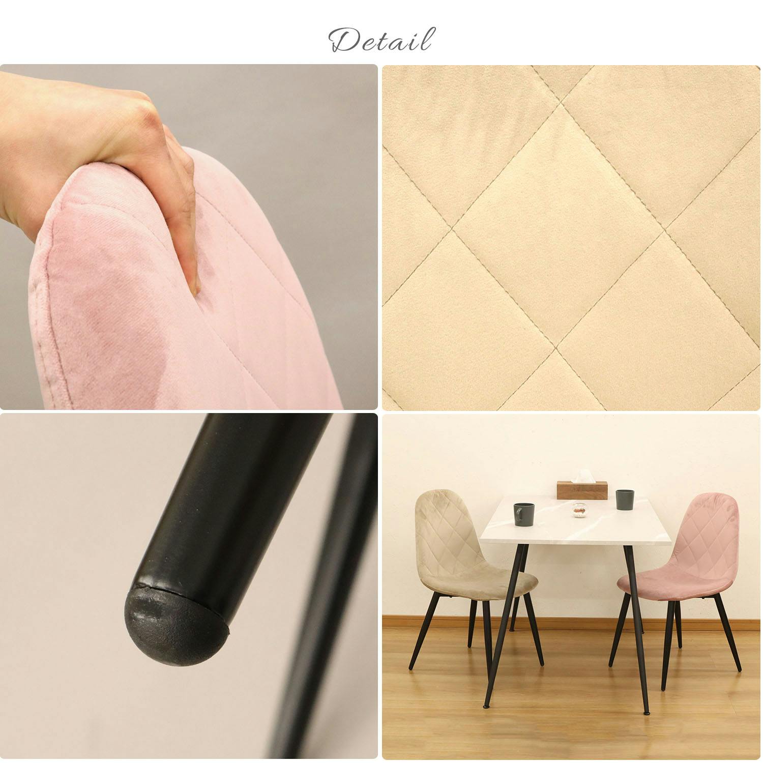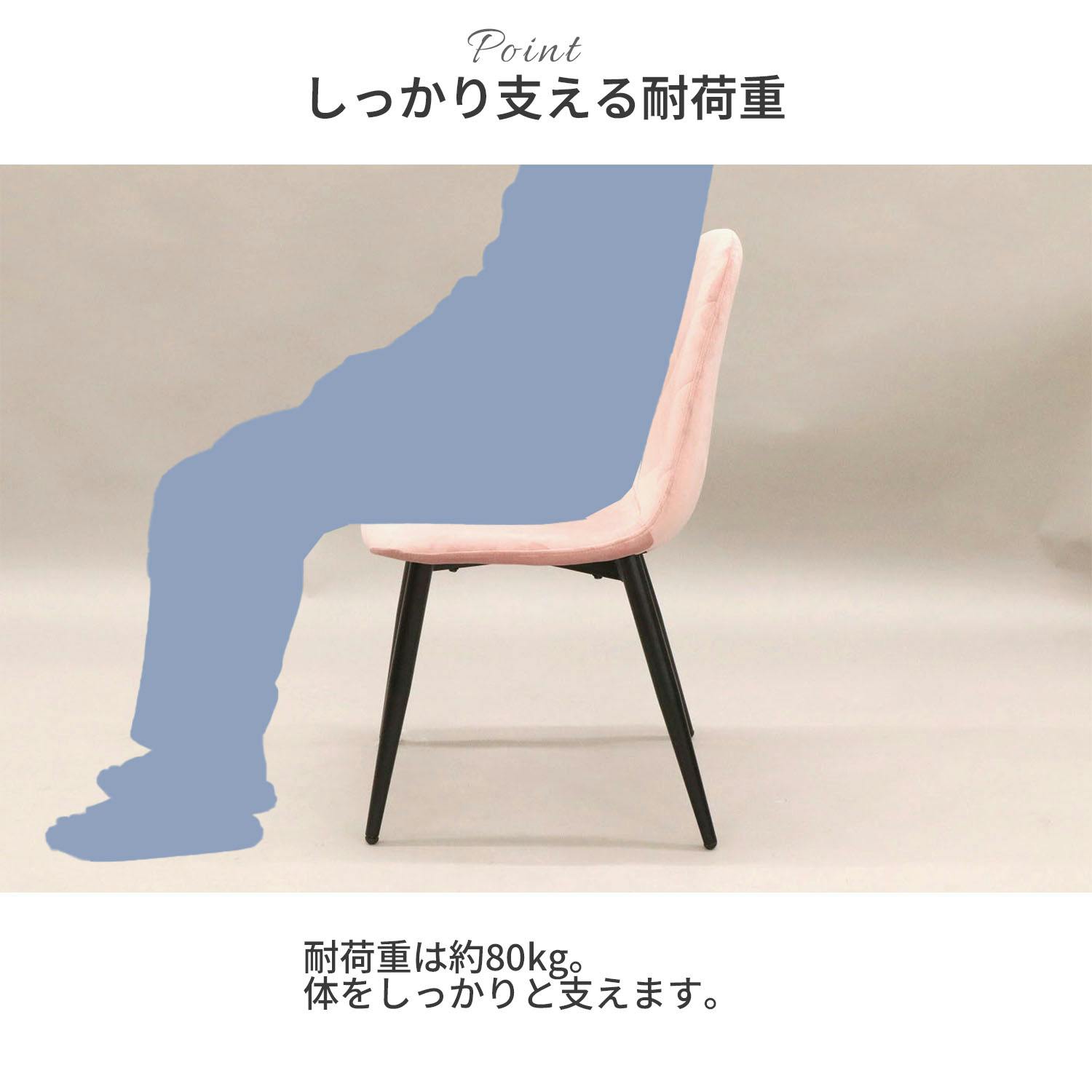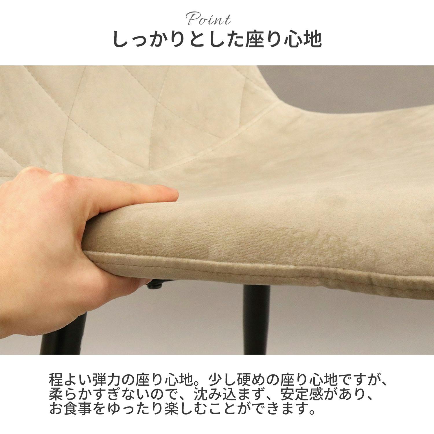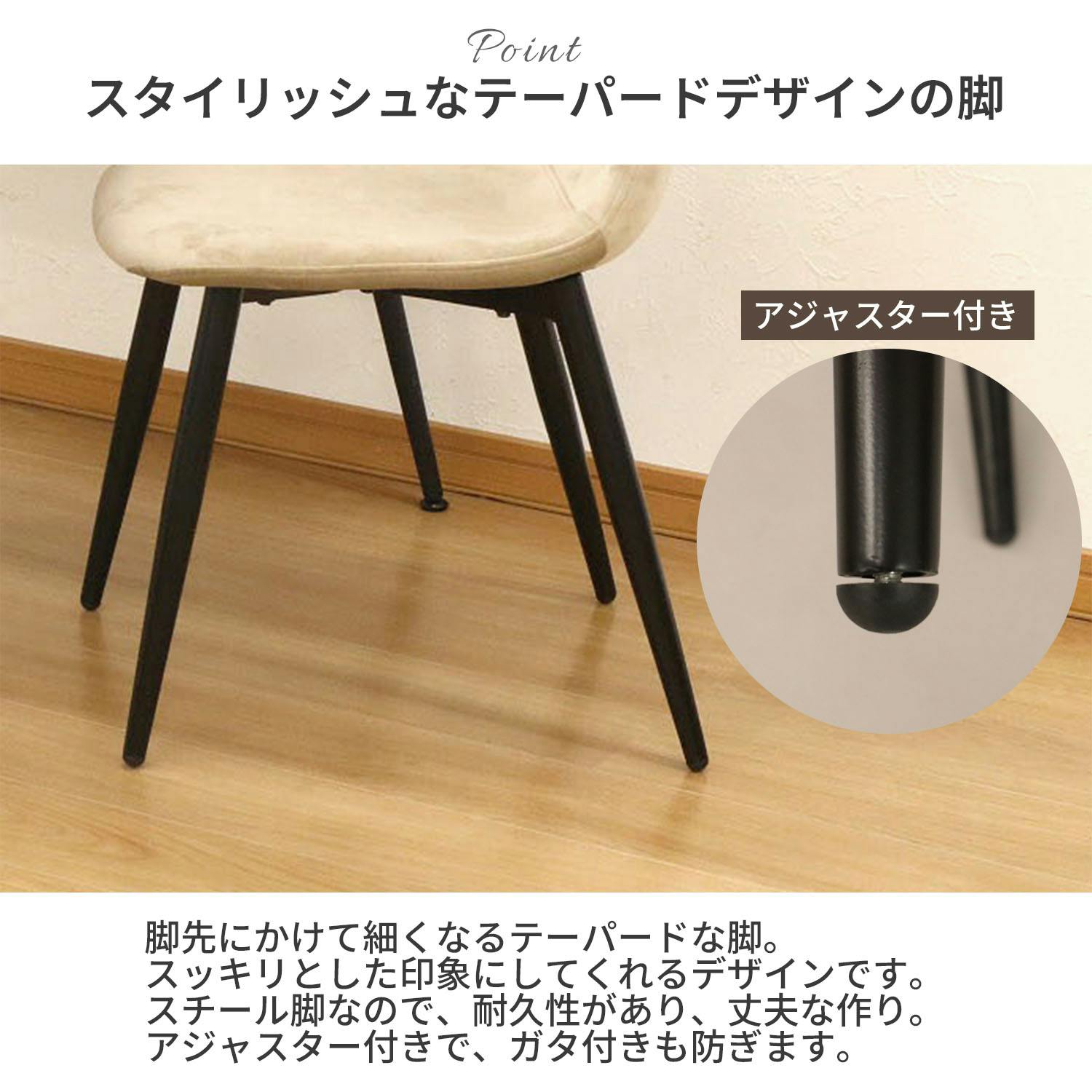 ●上品なくすみトーンのダイニングチェアです。●微起毛で柔らかい肌触りの、ベロア生地を使用しております。ずっと座っていられる、優しい手触りが特徴です。●座面が体に優しくフィットするので、快適にお座り頂けます。●脚はスチール製なので耐久性があり、丈夫な造りです。●アジャスター付きで、接地面とのガタ付きも防げます。●耐荷重約80kgの座面が体をしっかりと支えます。