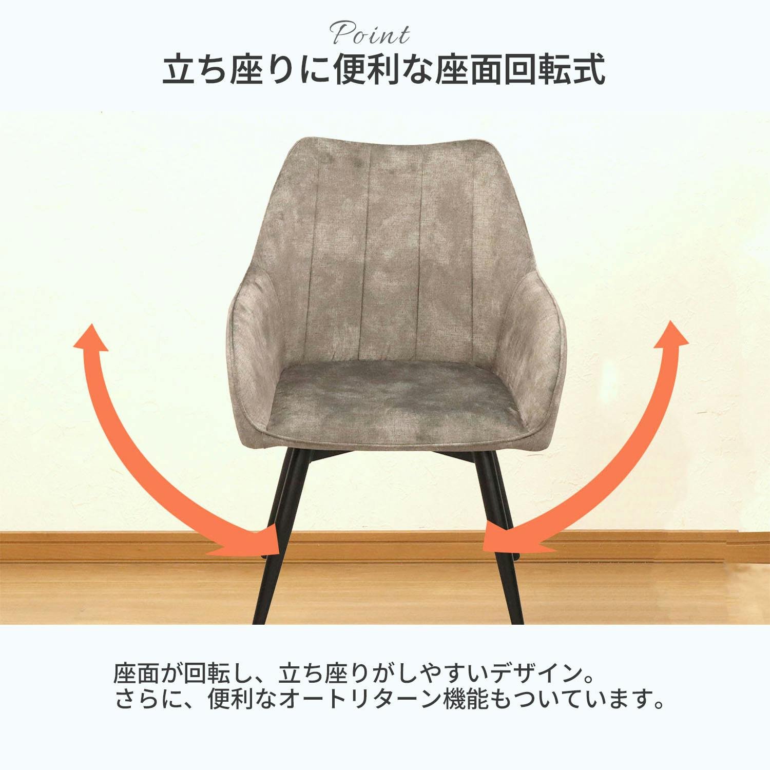 ●上品なくすみトーンのダイニングチェアです。●座面が180度可動し、立ち座りがしやすいデザインです。便利なオートリターン機能も付いております。●脚先にかけて細くなる、スタイリッシュなテーパードデザインの脚です。●脚はスチール製なので耐久性があり、丈夫な造りです。●アジャスター付きで、接地面とのガタ付きも防げます。●耐荷重約80kgの座面が体をしっかりと支えます。