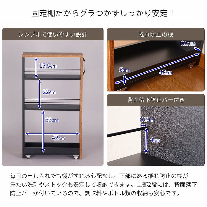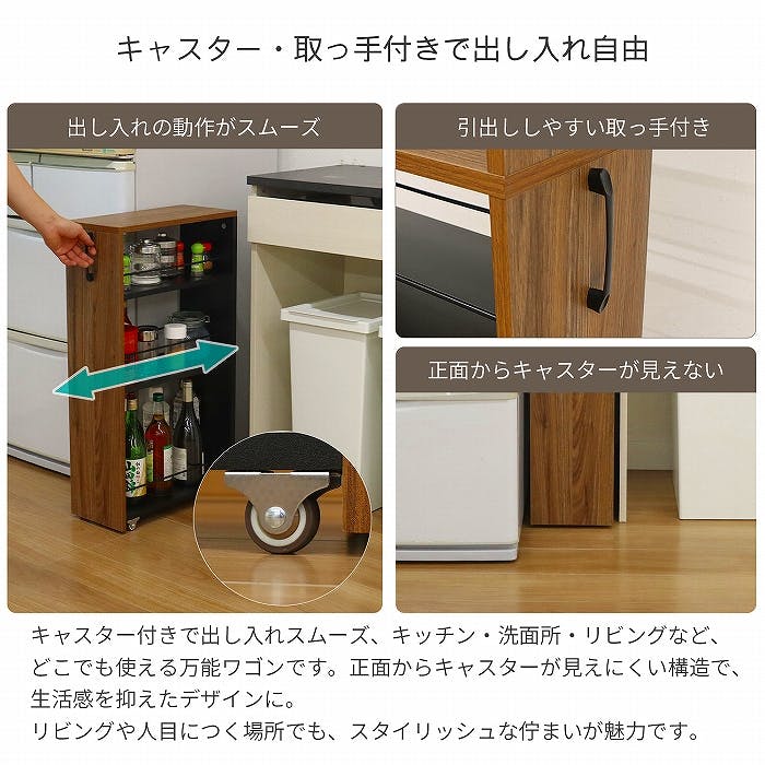 こんな場所で使えます!キッチンボードや冷蔵庫脇の隙間収納にキッチンカウンターやランドリー用の収納にデスク脇にサイドワゴンとして※必ず物と物のすきまでご使用ください。すきま以外のご使用は転倒の危険性があります。また、動かすときは隙間からすべて出さない等、転倒に十分ご注意ください。