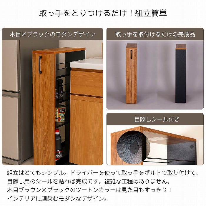 背面落下防止バー付きでボトル類の収納も安心。下部には揺れ防止の桟がワゴンをしっかりと安定させてくれます。水や汚れに強いメラミン樹脂化粧繊維板を採用。組立はとてもシンプル。ドライバーをご用意いただいて、ボルトで取っ手を取り付けるだけの完成品です。木目ブラウン×ブラックのスタイリッシュなツートンカラーは、見た目もすっきり、インテリアに馴染むモダンデザイン。