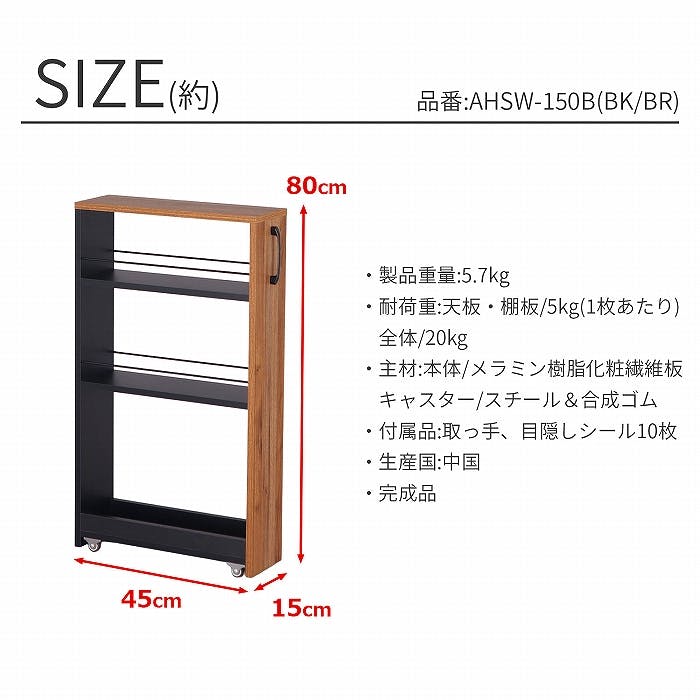 AIS 隙間ワゴン150(下棚)ブラック ブラウン 15×45×80cm AHSW-150B BK BR 移動式収納庫 キッチン リビング 書斎 調味料ストック 食品ストック キッチン用品 木製 4932528026964【別送品】