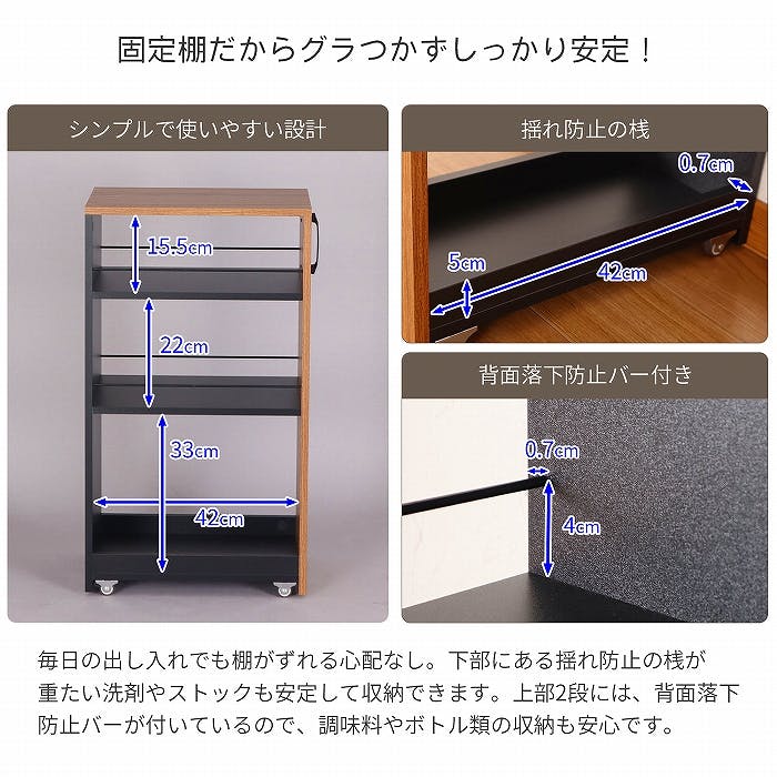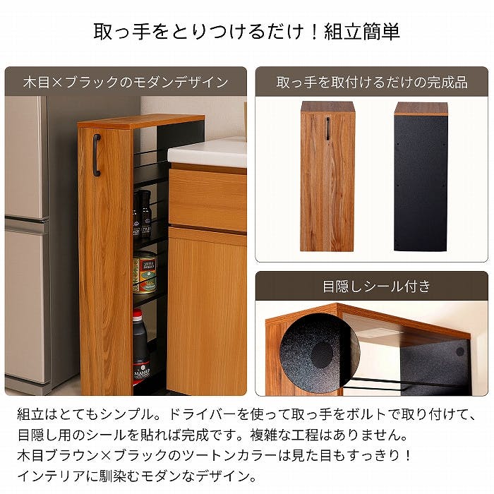 背面落下防止バー付きでボトル類の収納も安心。下部には揺れ防止の桟がワゴンをしっかりと安定させてくれます。水や汚れに強いメラミン樹脂化粧繊維板を採用。組立はとてもシンプル。ドライバーをご用意いただいて、ボルトで取っ手を取り付けるだけの完成品です。木目ブラウン×ブラックのスタイリッシュなツートンカラーは、見た目もすっきり、インテリアに馴染むモダンデザイン。