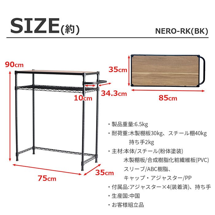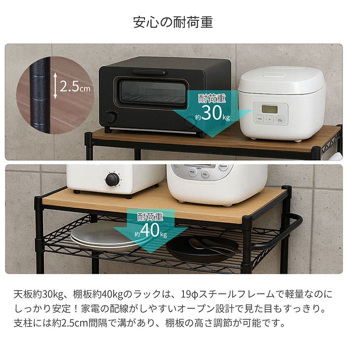 耐荷重(約)静止時/木製天板30kg、スチール棚40kg、持ち手2kg