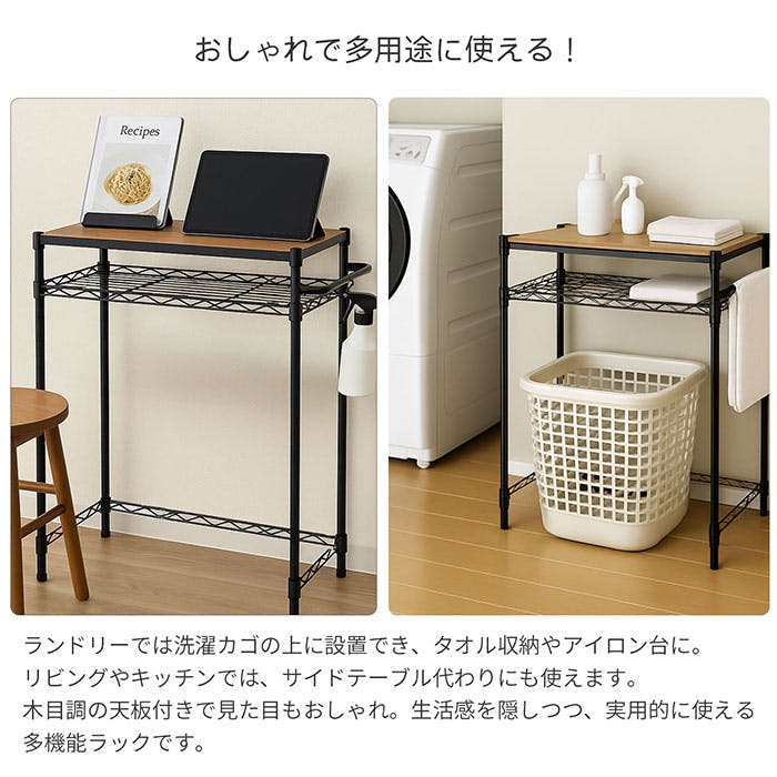 アジャスター付きで床のガタつきも安心。スリムな奥行35cmで壁付けにも最適。調理中の料理を置いたり、グラスや食器を一度に運びたい時に活躍!片側に付いた取っ手は移動時の持ち手になるだけでなくタオルを掛けたり、S字フックがあればそれを使って小物を掛けたり利用できます。※本商品にはS字フックは付属しておりません。■こんな場所で使えます!■キッチン・ダイニング・ランドリーにもマルチに活躍リビングやキッチンでサイドテーブル代わりにも活躍ランドリーで洗濯カゴの上に設置してタオル収納やアイロン台にも