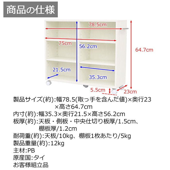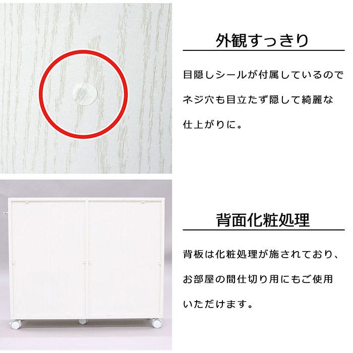 ワゴン本体を支えるキャスターは5個のうち2個がストッパー付きで、ワゴンの位置を固定できます。ネジ穴を隠すための目隠しシールが付属しておりますので、綺麗な仕上がりでお部屋に設置していただけます。背面の背板は化粧処理が施されております。お部屋の間仕切りとしても使用できるため、レイアウトの幅が広がります。各収納物の収納可能数(目安)●少年コミックス(新書判)/約96~132冊●CDケース/約204~396枚DVDケース/約132~336枚