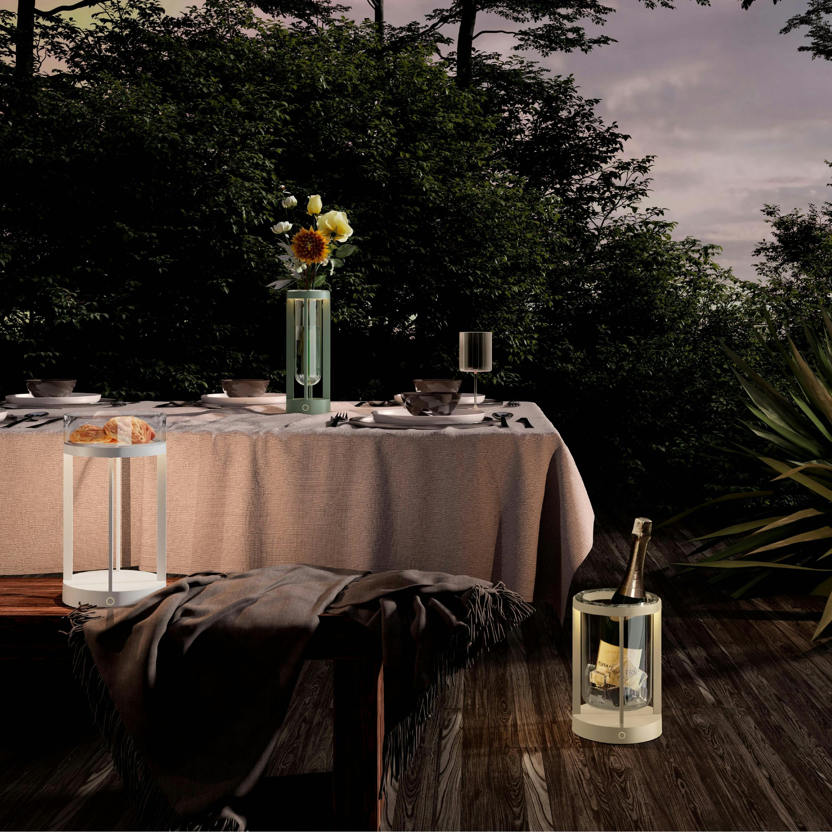 独特なデザインのランプは、氷を入れることによりワインクーラーとしても使用できます。薄暗い中PILLARの優しい光に包まれながら、冷えたワインを手に取れば日常が一瞬で特別な時間に変わります。高級感と機能性を兼ね備えたPILLARで、宵の時間をよりラグジュアリーに。寸法:φ170×250(mm)