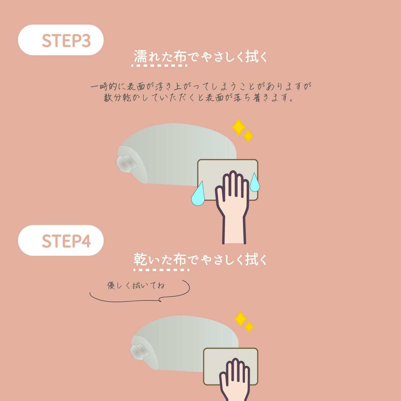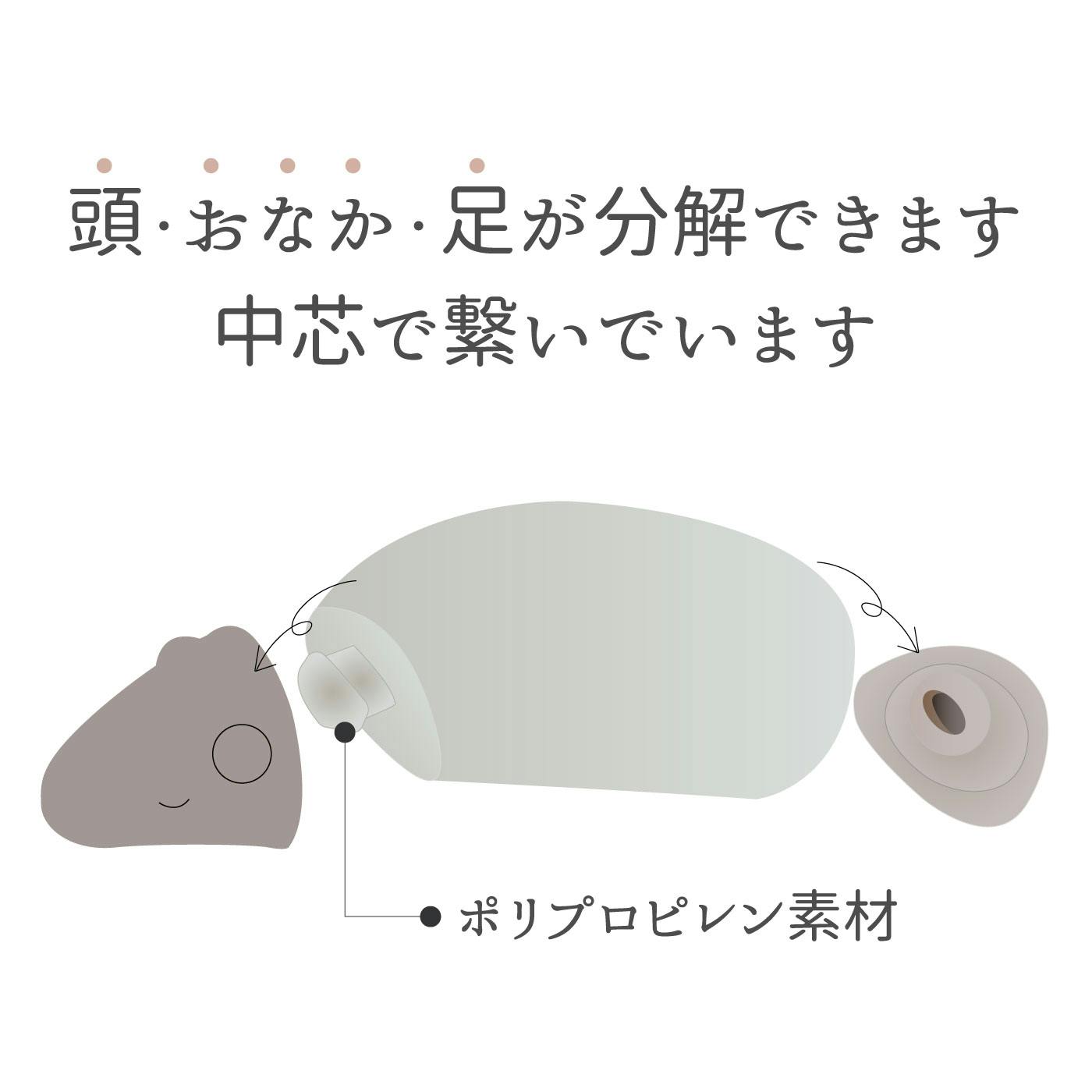 頭と足はシリコン素材でできている為、水洗い可能。体は食器洗い用の中性洗剤を溶かした水に布を濡らし、硬く絞りおなかを拭きます。最後に洗剤のついていない濡れた布で拭いてお手入れ完了です。※アルコールのご使用はお控えください。