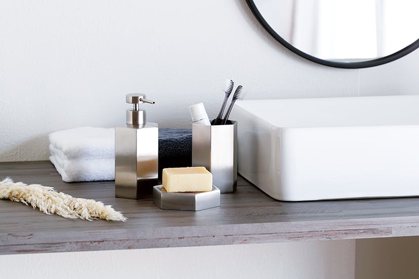 サニタリーをおしゃれに演出してくれる、ステンレスの小物たち。錆びにくいステンレス製。シンプルなつくりのためお手入れも簡単に行えます。約109×109×26mm (92g)