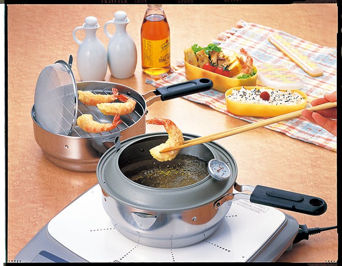 本体:18-0ステンレス鋼(底厚0.8mm)、ガード部:鉄(フッ素樹脂加工・板厚0.38mm)、ハンドル金具:18-0ステンレス鋼、ハンドル:フェノール樹脂、こしあみ:18-8ステンレス鋼、バットアミ:鉄線(クロームメッキ仕上げ)、温度計:200度対応 日本製