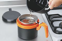 本体:鉄・フッ素樹脂加工、蓋:ABS樹脂、ハンドル・リング:66ナイロン樹脂、目皿・口金具:ステンレス鋼(18-0)、アミ:ステンレス鋼(18-8)40メッシュ 日本製