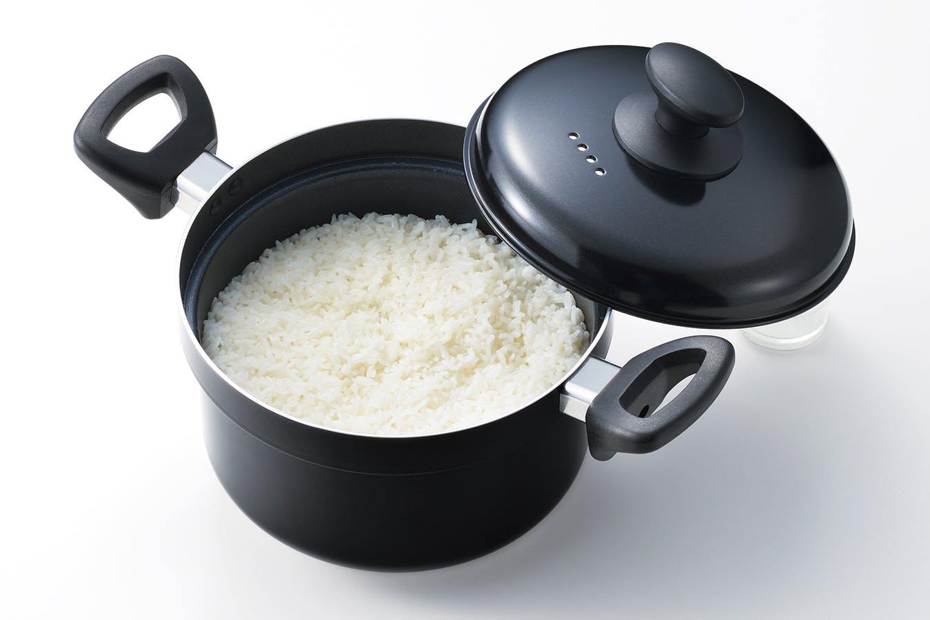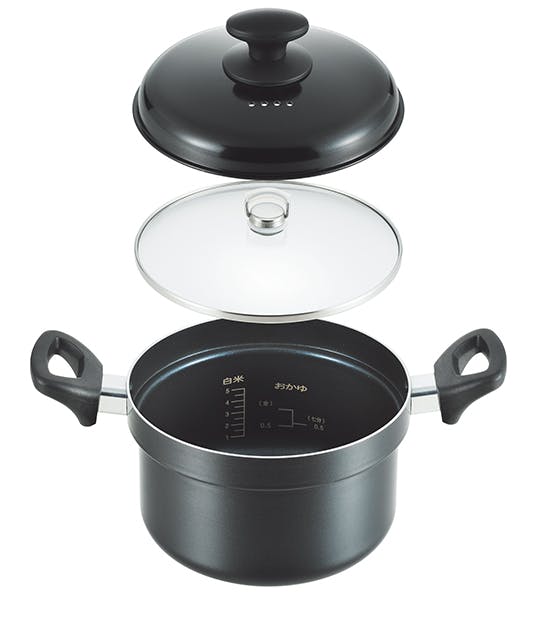 鍋内側は容量の目安が確認しやすい目盛付。内面フッ素加工でお手入れがしやすい。煮込み料理にも重宝する深型です。炊飯に便利な2種の蓋付き。ガラス蓋とアルミの蓋の2種類が付属しています。ガラス蓋は炊飯時に、炊き具合の決め手になる「カニ穴」の確認がしやすいです。蓋を開けることなく確認ができるため蒸気を逃さずとっても便利。